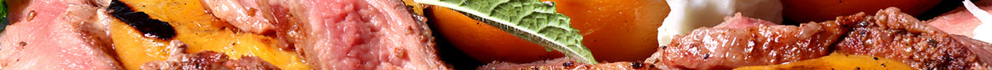 Het vlees snijden we dwars op de draad en serveren we met de perzik, mozzarella en munt.