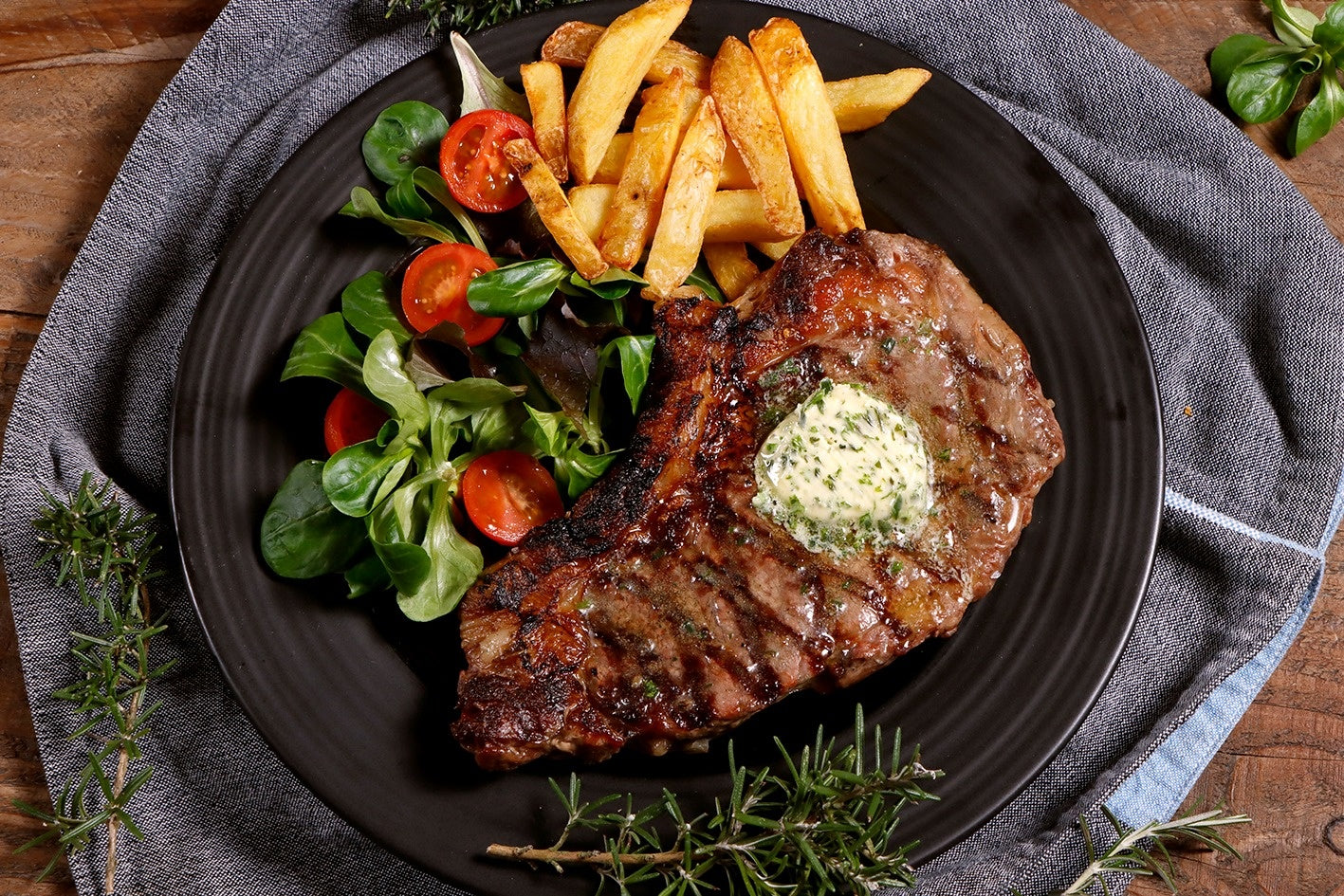 Er gaat niets boven een perfect gegrilde steak met een grillruit en gekarameliseerde smaak van een houtskoolvuur. Op de steak leggen we wat zelfgemaakte kruidenboter....