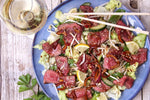We willen de biefstuk rauw als tonijnsteak, maar wel met een grillsmaak. Laat de biefstuk even rusten en maal er wat verse zwarte peper over. Snijd dan dunne plakjes.
