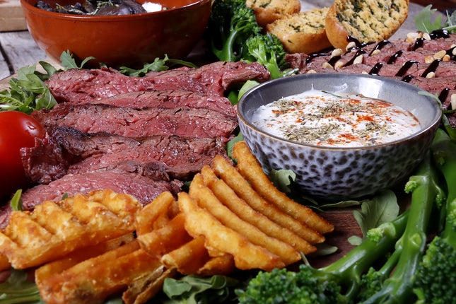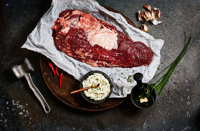 Pure Canadian Heritage Angus Flap Meat Vol van karakter, perfect voor de BBQ De Pure Canadian Heritage Angus Flap Meat, ook wel bavette genoemd, is een geliefd stuk rundvlees onder BBQ-liefhebbers. Dit vlees, gesneden uit de onderkant van de dunne lende, heeft een grove structuur, diepe rundvleessmaak en een mooie marmering. Perfect voor een korte, hete grill of een langzame garing op lage temperatuur. Afkomstig van Heritage Angus-runderen uit Canada, die 180 dagen graan gevoerd worden, heeft deze flap meat een prachtige balans tussen malsheid en stevigheid. Bovendien is het vlees volledig vrij van antibiotica, wat zorgt voor een pure en authentieke vleesbeleving. Bereidingssuggestie:Laat het vlees op kamertemperatuur komen en kruid het met grof zeezout, peper of een dry rub naar keuze. Grill de bavette op hoge temperatuur tot een kerntemperatuur van 50-52°C voor medium-rare en laat het daarna enkele minuten rusten. Snijd het vlees tegen de draad in dunne plakken voor de perfecte bite. Of je hem serveert met chimichurri, in fajitas of gewoon puur van de BBQ, de Pure Canadian Heritage Angus Flap Meat levert altijd een krachtige en malse steakervaring.