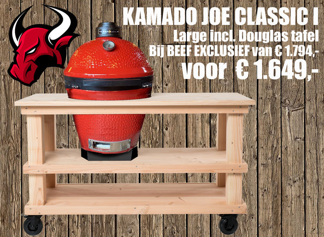 KAMADO JOE CLASSIC 1 INCLUSIEF DOUGLAS TAFEL – NU VOOR € 1.649,- (Van € 1.794,-) Productomschrijving De Kamado Joe Classic 1 tilt vakmanschap en innovatie naar een hoger niveau. De dikwandige, hittebestendige behuizing houdt zowel rook als sappen vast, ongeacht de temperatuur, voor een optimale kookervaring. Onder het gemakkelijk te openen deksel vind je een ruim grilloppervlak van hoogwaardig RVS 304, perfect voor het bereiden van 10 tot 12 grote stukken vlees of kip. Kenmerken van de Kamado Joe Classic 1: Flexibel Divide & Conquer® grillsysteem voor veelzijdigheid in het grillen. Robuuste gietijzeren voet op wielen voor eenvoudige verplaatsbaarheid. Precisieventilatieschuif voor nauwkeurige temperatuurcontrole. Gepatenteerde uitschuifbare aslade voor gemakkelijk schoonmaken. De Kamado Joe Classic 1 is op voorraad en klaar voor gebruik! Douglas Tafel Standaard De Douglas Tafel biedt de perfecte opstelling voor je buitenkeuken, ideaal voor het delen van kookplezier met familie en vrienden. Het Douglashout is duurzaam, sterk en bestand tegen de elementen, wat het perfect maakt voor tuinmeubelen. Het hout heeft een licht geelrood tot geelbruine kleur, die na verloop van tijd mooi vergrijst en een elegante uitstraling krijgt. Kenmerken van de Douglas Tafel: 4 zwenkwielen voor makkelijke verplaatsing naar de gewenste plek. Bescherming tegen UV-straling en vocht met optioneel afdekhoes (apart bij te bestellen). Bij aankoop van deze prachtige combinatie zorgen wij voor persoonlijke levering op een moment dat het jou uitkomt. We nemen vooraf contact met je op om alles te regelen. Let op: De tafel wordt volledig gemonteerd geleverd. Mocht de levering bijzonderheden vereisen (zoals trappen, smalle doorgangen of drempels), geef dit dan van tevoren aan. Pakketprijs: € 1.649,- (in plaats van € 1.794,-)