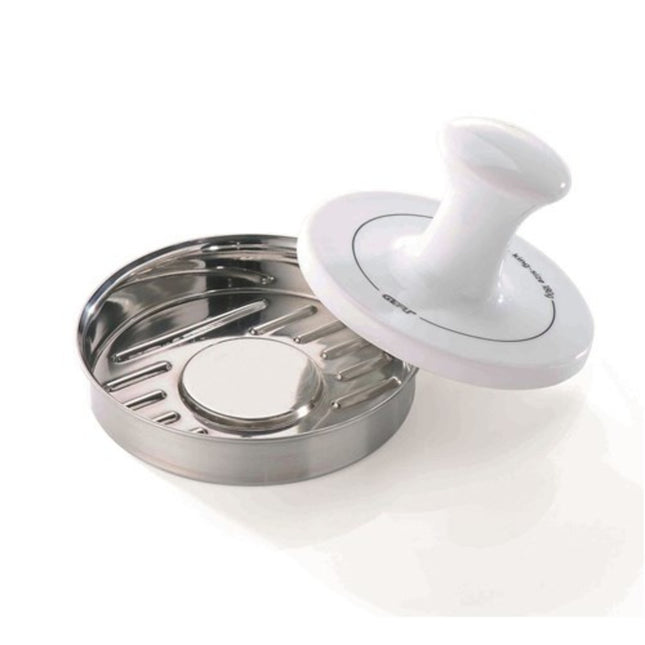 Gefu - Hamburgerpers BBQ Maak perfect gevormde burgers met de Gefu Hamburgerpers BBQ, geschikt voor zowel CLASSIC (120 g) als KING-SIZE (180 g) hamburgers. Deze stevige pers van aluminium met antikleeflaag zorgt ervoor dat het gehakt gelijkmatig wordt geperst en gemakkelijk van de pers loskomt. De groefoptiek geeft je burgers niet alleen die authentieke barbecuelook, maar verkort ook de baktijd, zodat je sappige en gelijkmatig gegaarde burgers serveert. Dankzij de handige kunststof handgreep ligt de pers comfortabel in de hand en werk je snel en efficiënt.