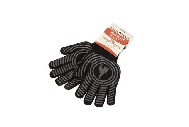 GrillTeam - BBQ Gloves (pair) De GrillTeam BBQ-handschoenen zijn de perfecte metgezel voor elke barbecuefanaat. Deze handschoenen bieden uitstekende bescherming tegen de hitte, zodat je veilig je gerechten kunt hanteren op de grill. Gemaakt van hoogwaardige, hittebestendige materialen, bieden ze een betrouwbare grip en comfort, zelfs bij het werken met hete pannen of op de barbecue. Kenmerken: Hittebestendig: Beschermt je handen tegen hoge temperaturen tijdens het grillen. Duurzaam: Gemaakt van sterk materiaal dat bestand is tegen slijtage. Comfortabel: Het ontwerp zorgt voor een goede pasvorm en bewegingsvrijheid. Veilig: De handschoenen bieden een stevige grip, waardoor je je gerechten veilig kunt hanteren en draaien. Ideaal voor het hanteren van hete voorwerpen zoals grills, pannen of schalen, en voor het bereiden van je favoriete gerechten op de barbecue. Perfect voor de serieuze grillmaster!
