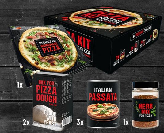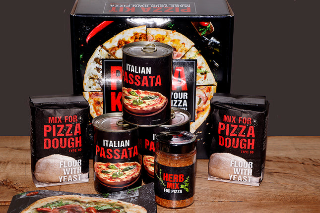 Geniet van de unieke smaak van zelfgemaakte pizza. Dat lukt gegarandeerd met de pizzamix, passata en kruidenmix uit dit pakket. Beleg je voorbereide deeg  met je favoriete toppings of laat je inspireren door een van onze recepten. De PIZZA KIT bevat:- 1x Receptenboekje (met vlees, vis, en vegetarische pizza recepten)- 2x Mix voor pizzadeeg- 3x Tomatensaus- 1x Pizzakruiden Ingrediënten:Mix voor pizzadeeg: zachte tarwebloem type 00, 1,5% droge gist (Saccharomyces cerevisae, emulgator: E491), natuurlijke TARWEdesem.Dit product kan sporen van soja en mosterd  bevatten.Tomatensaus: tomaten, zout, zuurteregelaar: citroenzuur.Herkomst tomaten: Italië.Pizzakruiden: zout, specerijen (paprikapoeder, chili, peper), kruiden (14% oregano, knoflook, 5% tijm), groenten (paprikavlokken).