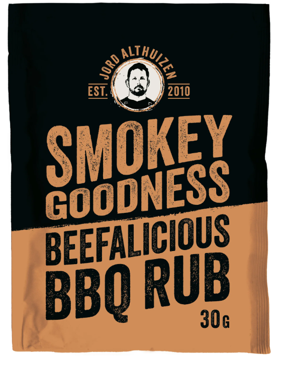 Smokey Goodness Beefalicious BBQ Rub De perfecte smaakmaker voor je rundvlees! Wrijf je vlees in met een royale hoeveelheid van deze rub en bereid de meest smakelijke steaks, pulled beef, beef ribs of brisket. Of je nu gaat voor een snelle grill of de ultieme low & slow bereiding, met Smokey Goodness heb je gegarandeerd succes.  Smokey Goodness BBQ kruidenMet meer dan 13 jaar ervaring heeft Smokey Goodness de kunst van low & slow barbecue tot in de perfectie verfijnd. Als pioniers op dit gebied brachten ze barbecue naar Nederland via catering op grote evenementen en festivals. Omdat het aanbod aan BBQ-kruiden destijds beperkt was, gingen ze zelf aan de slag met het creëren van smaakvolle mengsels. Door de jaren heen groeide het merk uit en werd het assortiment geprofessionaliseerd, zodat iedereen nu thuis kan genieten van de beste BBQ kruiden.Ingrediënten24% specerijen (peper, gerookte paprika, chilies, koriander, komijn), rietsuiker, zeezout, zout, groenten (knoflook, ui), 8% koffie, cacaopoeder, 1% kruiden.