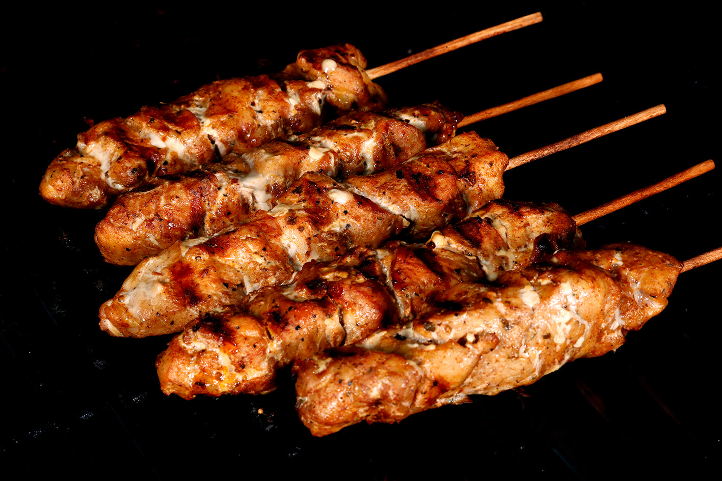Gaar de spiesjes indirect op ca 190 graden zonder risico op verbranden en grill ze eventueel nog even kort rondom af op direct vuur.
