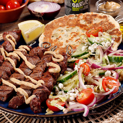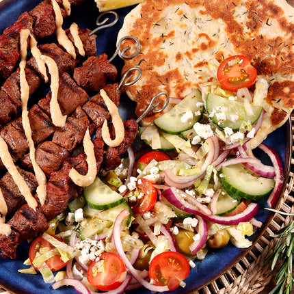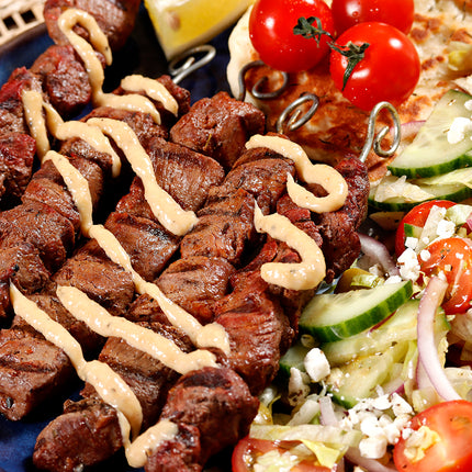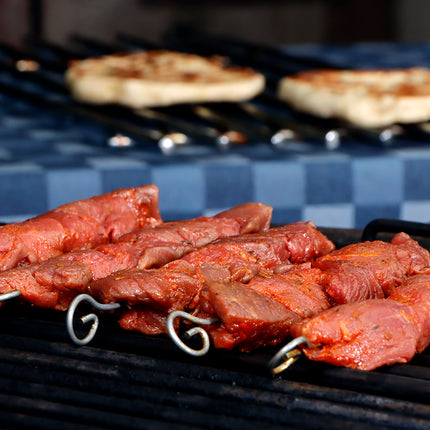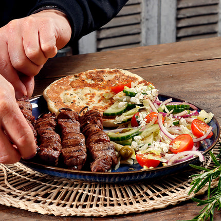 Zin in dat ontspannen Griekse vakantiegevoel, maar dan gewoon van je eigen BBQ? Deze Grieks gemarineerde biefstukspiesen van het Waards Rund brengen je zo naar een zwoele zomeravond aan de Middellandse Zee. Mals rundvlees van lokale oorsprong, gesneden in royale stukken en gemarineerd in een mix van mediterrane kruiden, olijfolie, knoflook en citroen – precies zoals je ze daar van de grill krijgt.