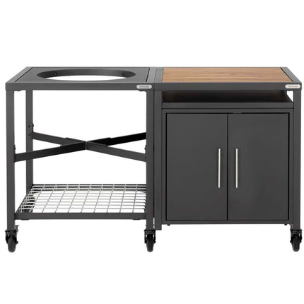 Het EGG Frame is gemaakt van hoogwaardig gepoedercoat aluminium en voorzien van stevige poten met zwenkwielen, zodat je eenvoudig de ideale kookplek creëert. De keramische tegelplaat in het onderstel voegt stabiliteit toe en beschermt tegen hitte. Het Expansion Cabinet biedt een robuuste opbergkast met verstelbare planken, zodat je houtskool, gereedschap en specerijen altijd binnen handbereik hebt.