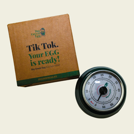 De metalen body van de wekker is Big Green Egg groen. Het binnenwerk is een kopie van de thermometer op de dome, maar dan met minuten in plaats van graden. Wel zo handig! De kookwekker is tot 60 minuten instelbaar en aan de achterzijde voorzien van een praktische magneet.