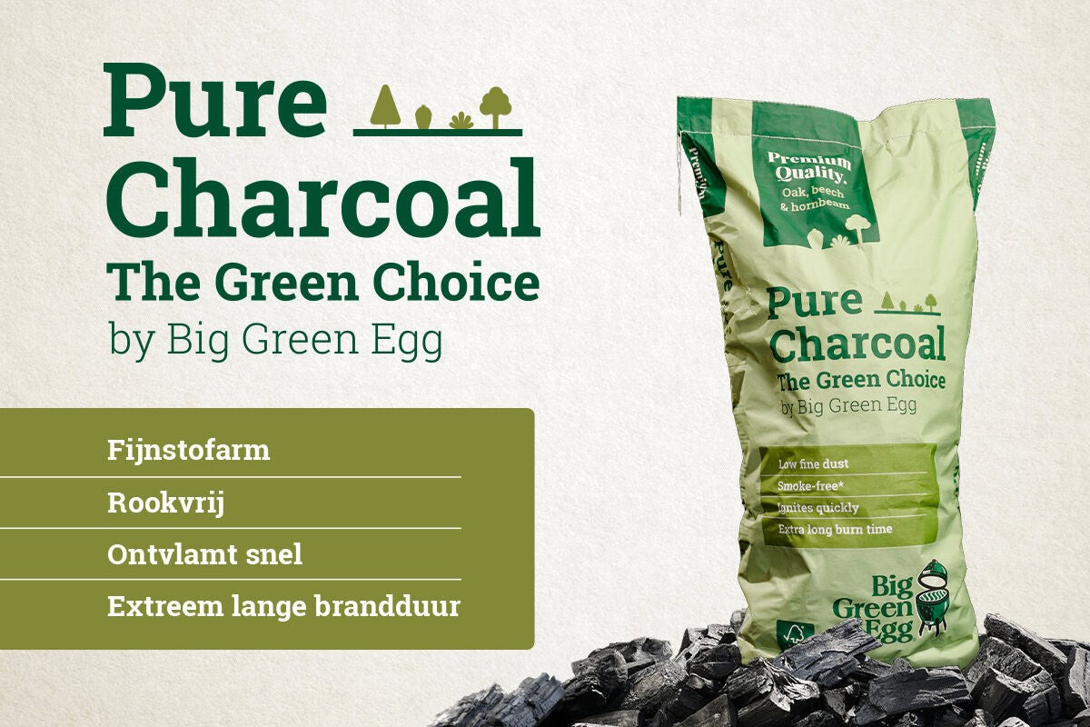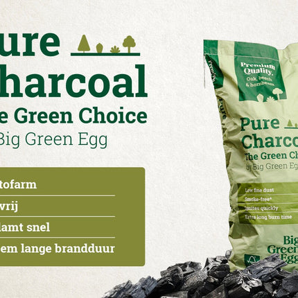 Beter voor het milieu en beter voor u. Big Green Egg Pure Charcoal maakt Big Green Egg nog groener en duurzamer. Deze revolutionaire houtskool, gekenmerkt door zijn ongeëvenaarde zuiverheid, wordt geproduceerd via een uniek proces en resulteert in een product dat rijk is aan koolstof, vrijwel fijnstofvrij en praktisch rookvrij. "Praktisch", omdat er af en toe rook kan ontstaan door aanmaakblokjes, druipend vet of onverkoold materiaal uit het productieproces.