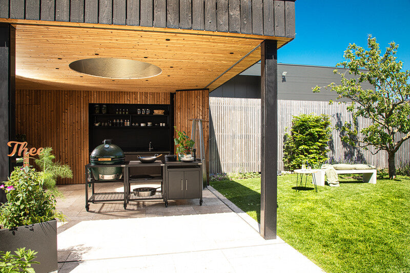 Deze combinatie van staal, hout en functioneel grid geeft je maximale flexibiliteit én uitstraling. Je buitenkeuken, maar dan op topniveau.