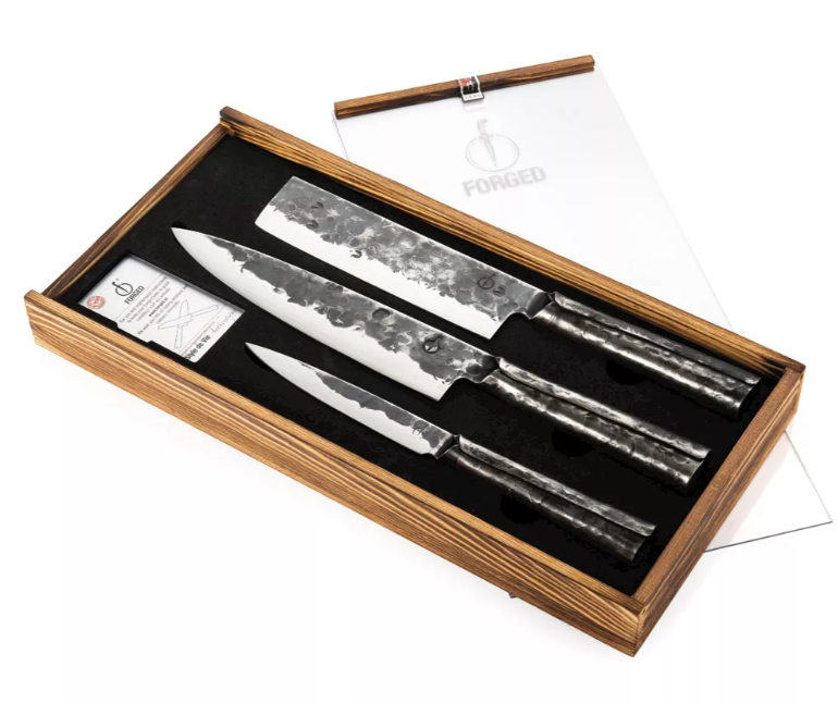 De Forged Brute 3-delige messenset is stoer, robuust en onverwoestbaar — precies wat je van Forged mag verwachten. Deze set bestaat uit een koksmes, hakbijl en universeel mes, waarmee je elke snijklus in de keuken moeiteloos aankan.