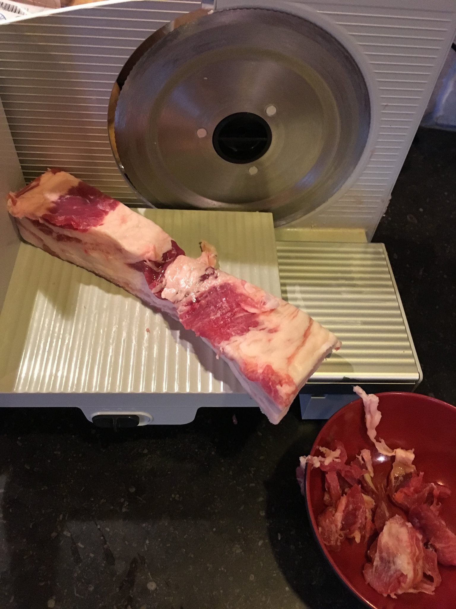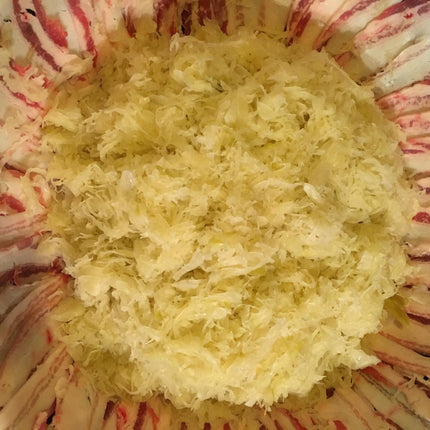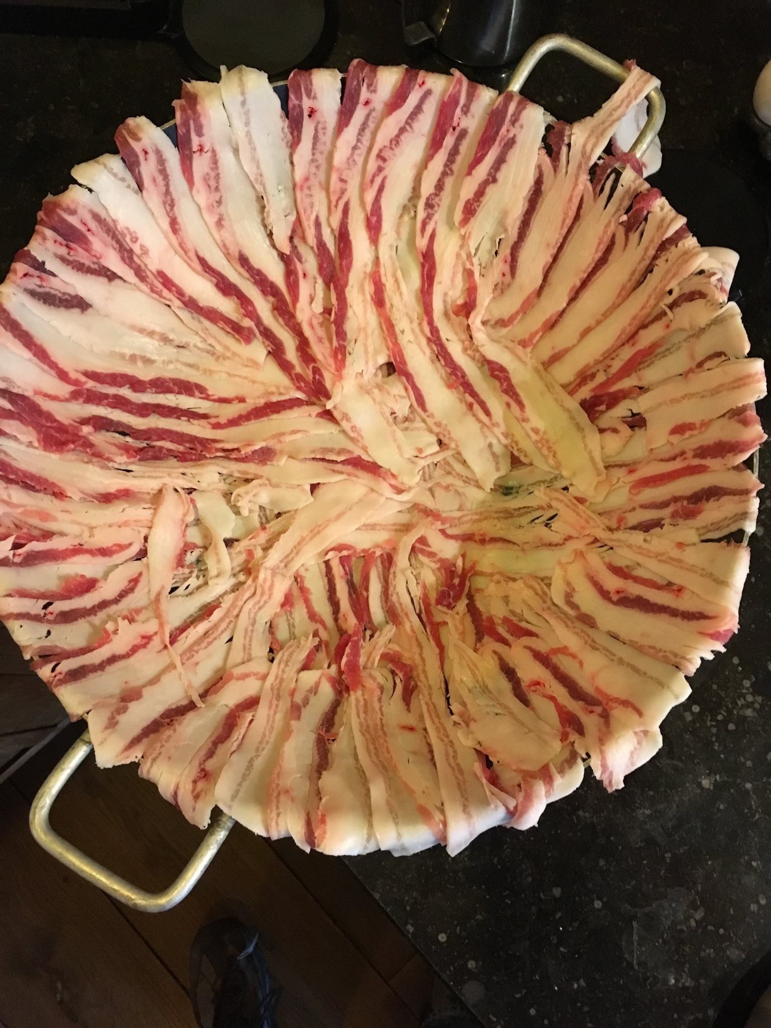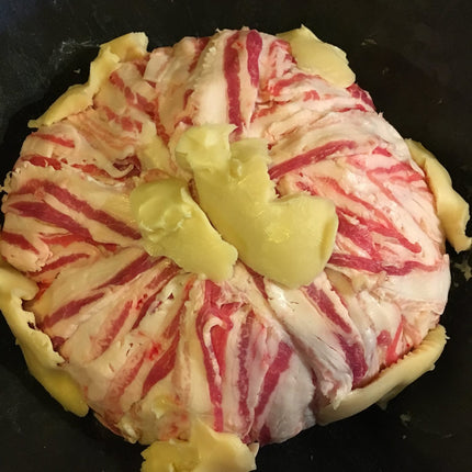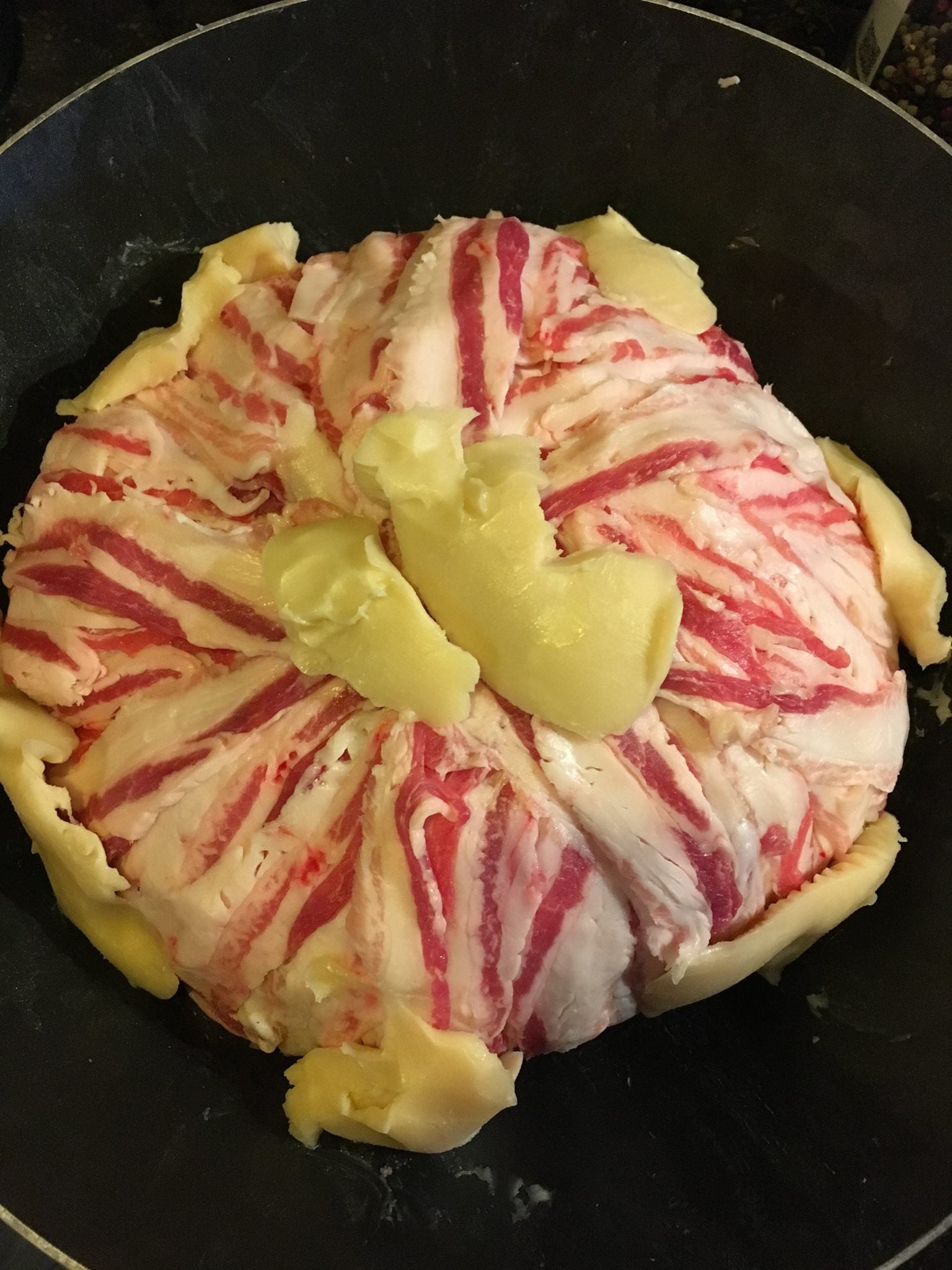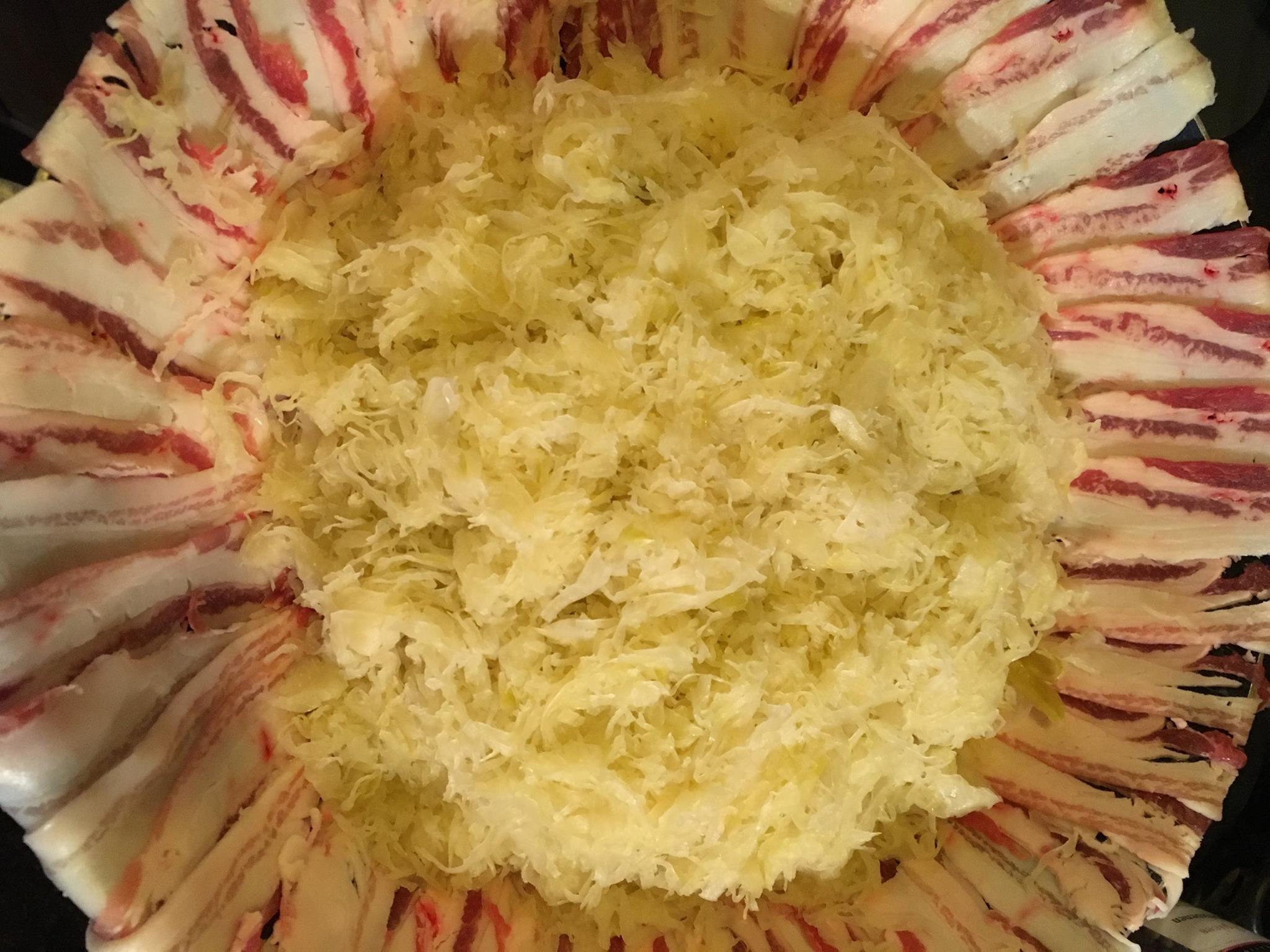 We hebben een mooi stukje Iberico Panceta in plakken gesneden en daar de wok mee bekleed. Daarop hebben we een kilo zuurkool gelegd en vervolgens een koffiefilter gevuld met gekneusde jeneverbessen, peper, thijm, laurier en kruitnagels. Dit dichtgevouwen en op de zuurkool gelegd. Daar bovenop nog een pond zuurkool uitgespreid en 300 gram ganzenvet.