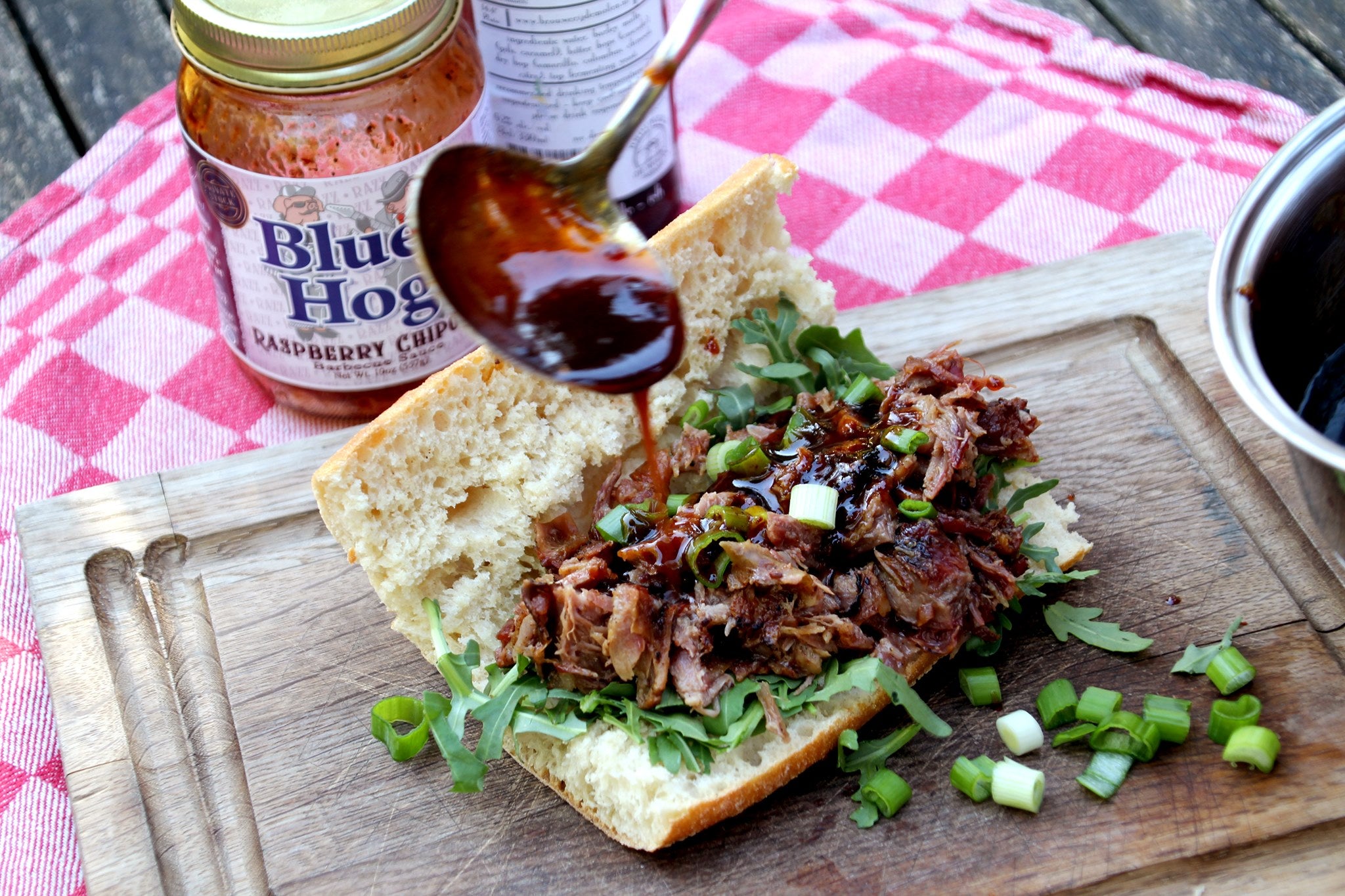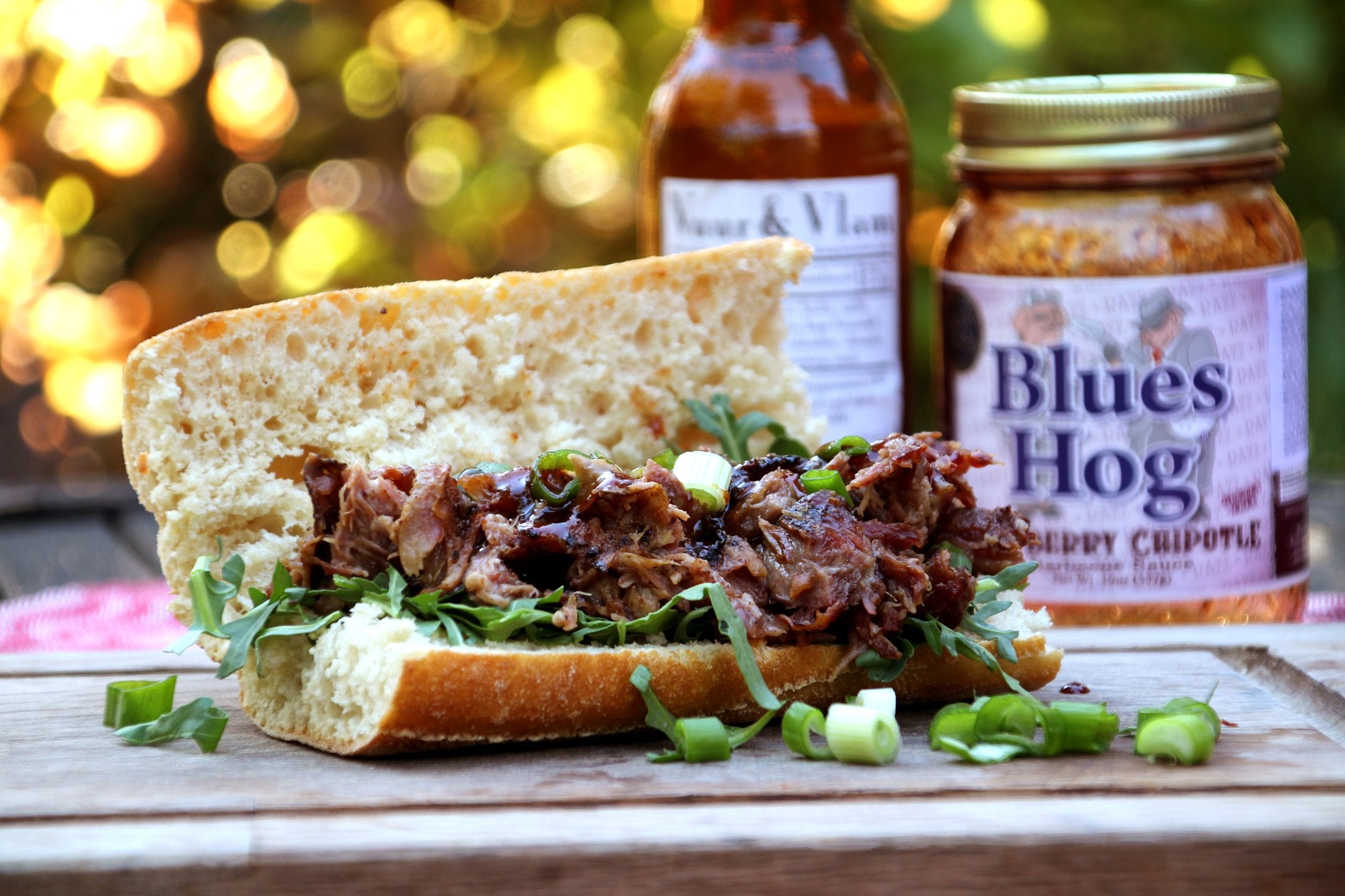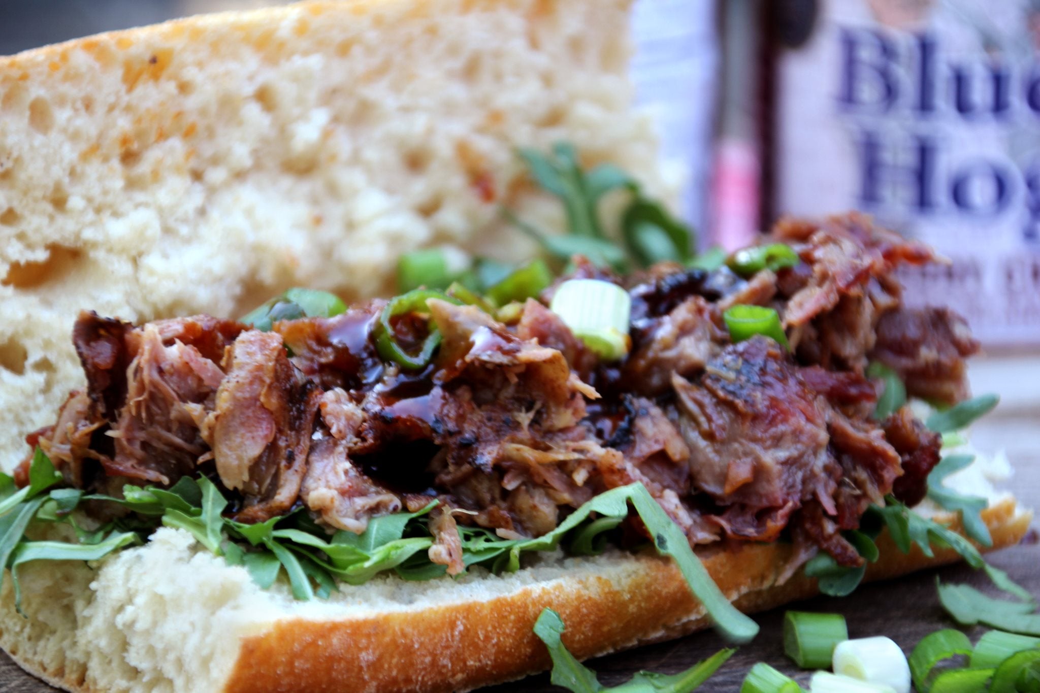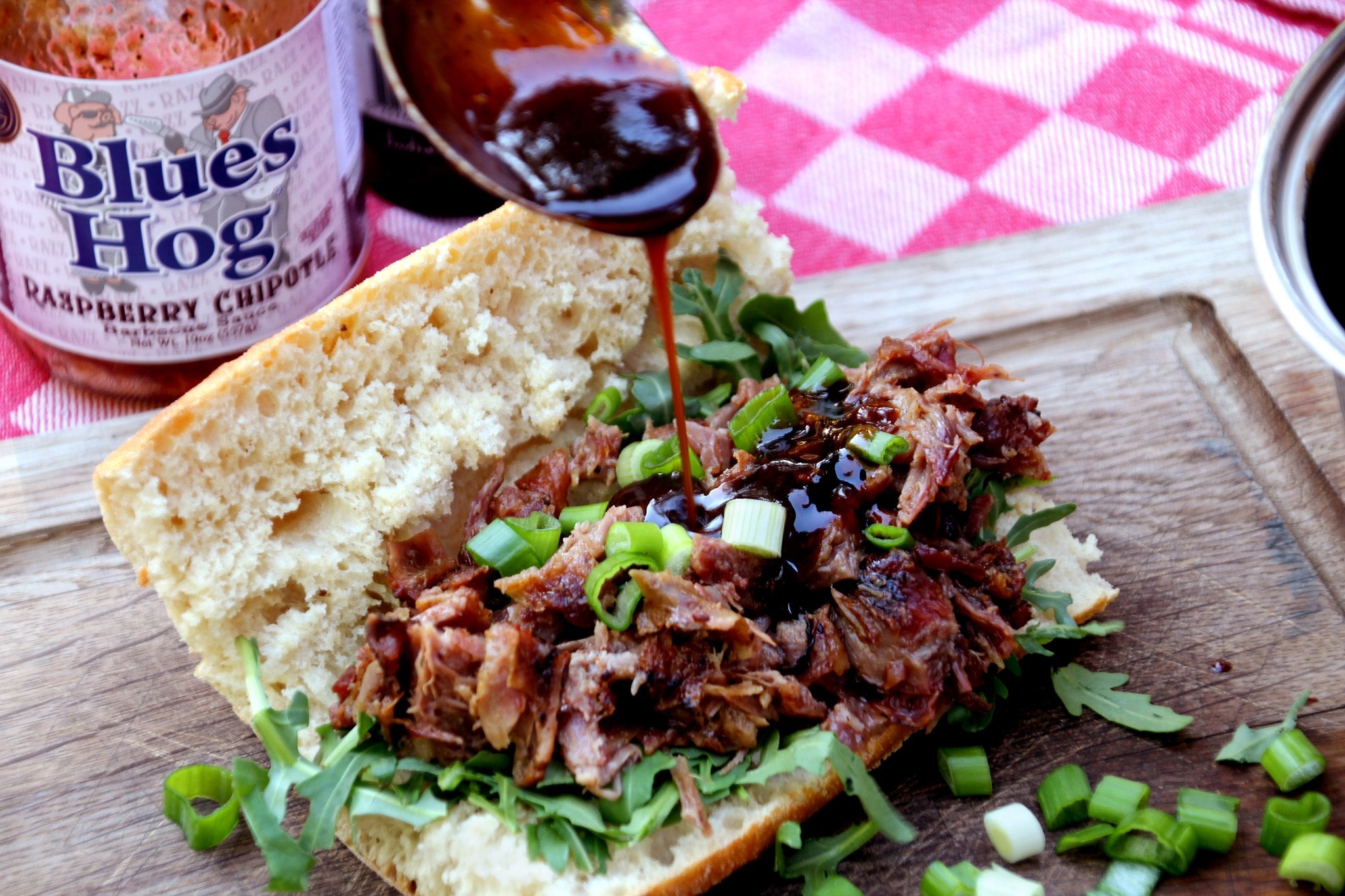 Als alles gestapeld is gieten we er een halve pot Smokey Mountain BBQ saus van Blues Hog overheen.