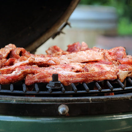 De Big Green Egg zetten we indirect op rond de 140-145 graden.
