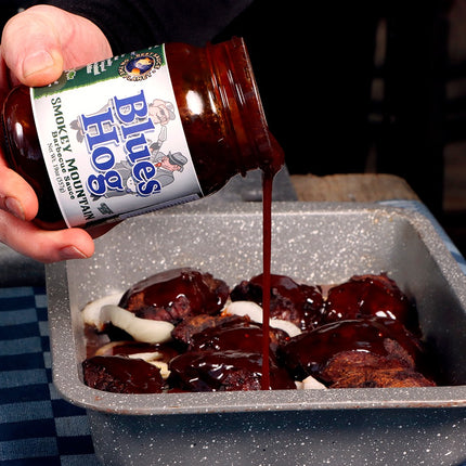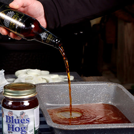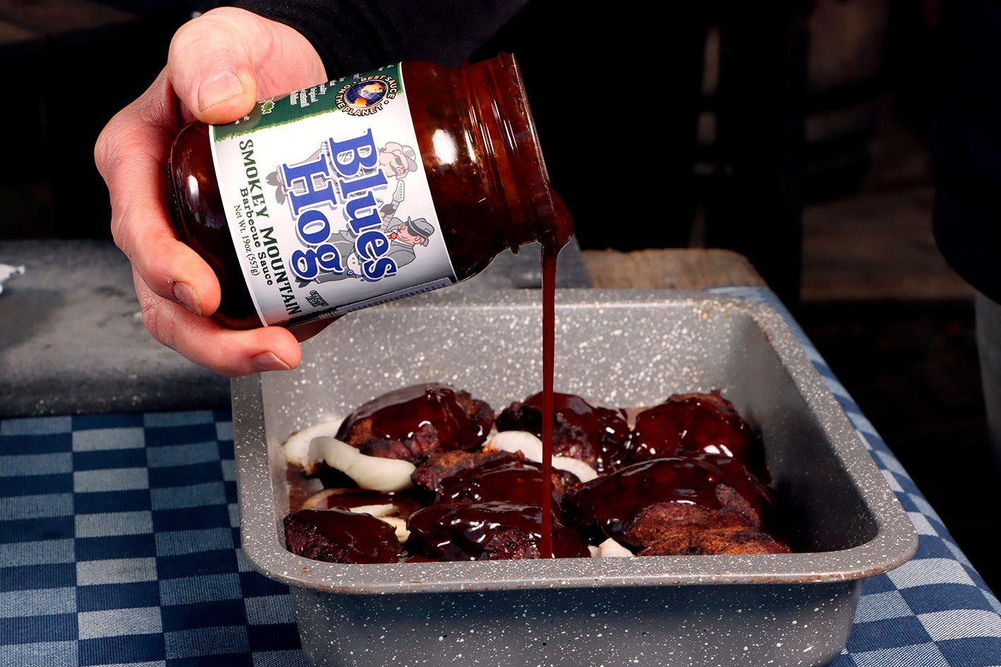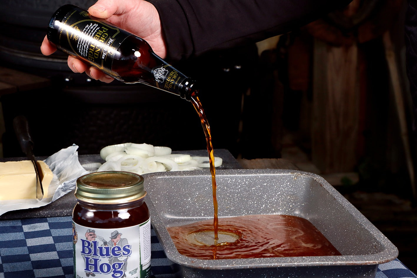 We snijden 2 kleine witte uien in ringen en leggen deze op de boter. Hierop gaan de wangetjes en daar schenken we weer Smokey Mountain BBQ sauce van Blues Hog over.