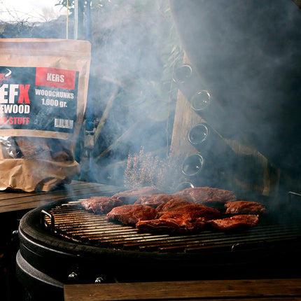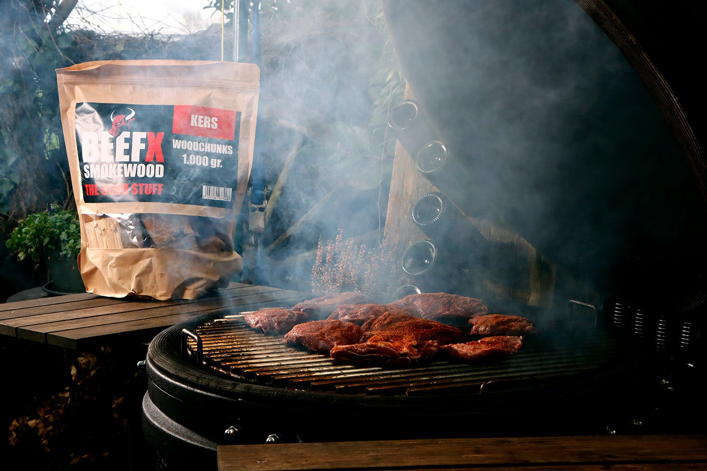 Op de gloeiende kolen leggen we 2 blokjes kersenhout van de BEEFX SMOKEWOOD lijn ’The good stuff’.