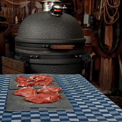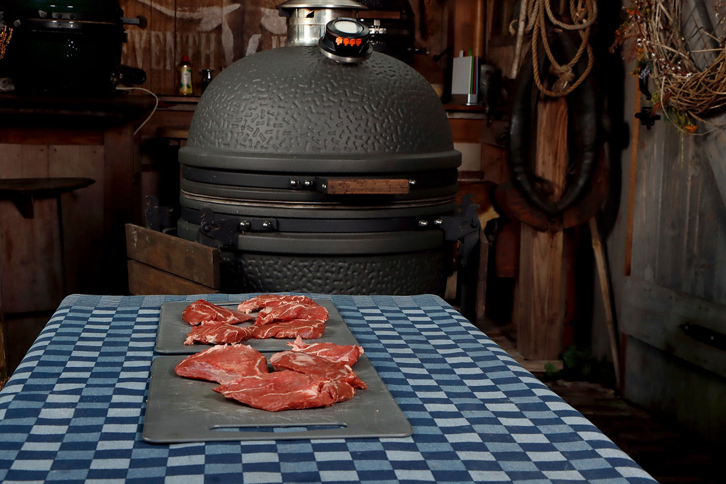 De kamado stellen we in op 110 graden rooster temperatuur en indirect heat.