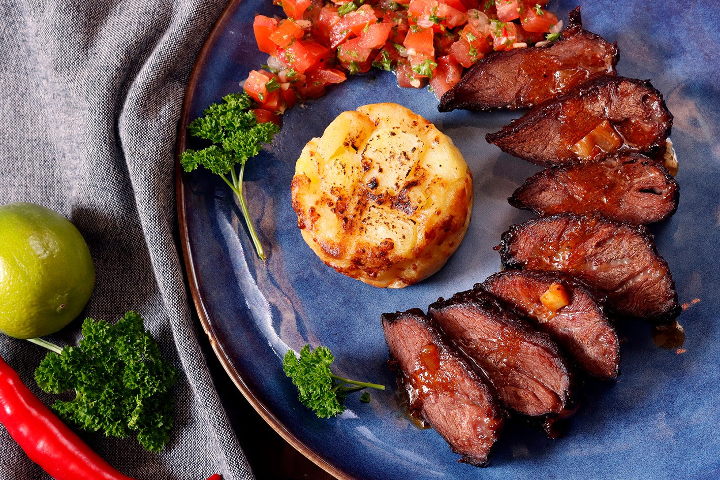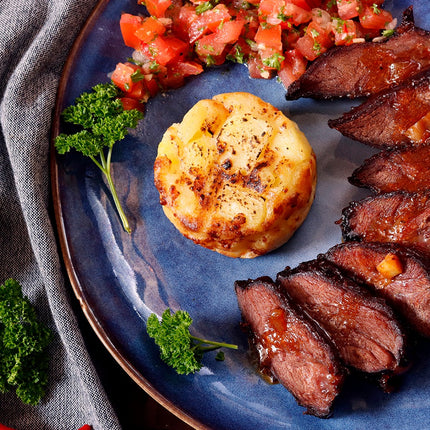 Als de wangen klaar zijn serveren we deze met een romige aardappelgratin en de fris zure Pico di Gallo, een heerlijke tegenhanger voor de zoet/rokerige varkenswangen.