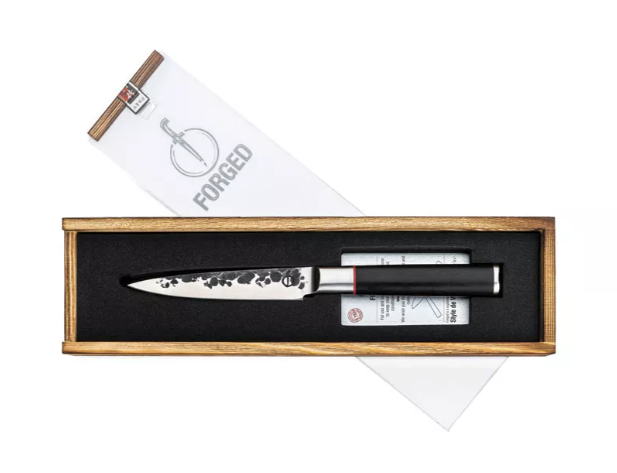Het Forged Sebra Universeel mes is de compacte variant van het koksmes en ideaal voor het snijden van groenten en kleinere stukken vlees. Het smalle, scherpe lemmet biedt maximale precisie, waardoor je zelfs de fijnste snijwerkzaamheden moeiteloos uitvoert.