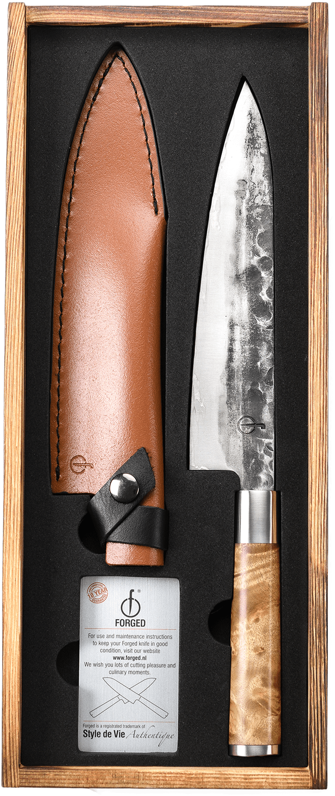 Het mes wordt geleverd in een luxe houten kistje, inclusief leren beschermhoes, en heeft een garantie van 10 jaar.