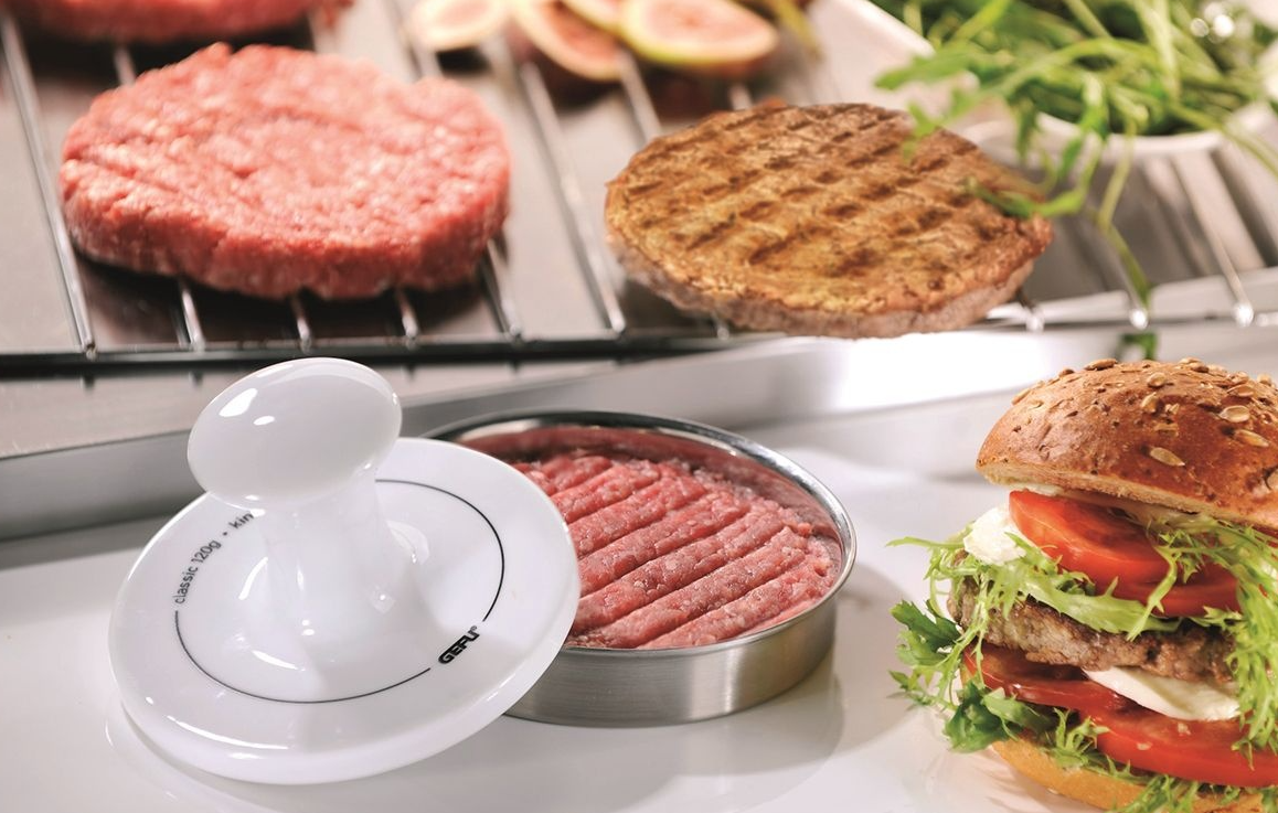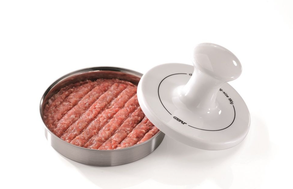 De welving in de RVS schaal zorgt ervoor dat de burger zijn vorm behoudt tijdens het bakken, terwijl de gleuven in de stamper bijdragen aan een snelle en gelijkmatige garing. Ideaal voor klassieke burgers van 120 gram en een diameter van 12 cm – precies het formaat voor een perfecte maaltijd.