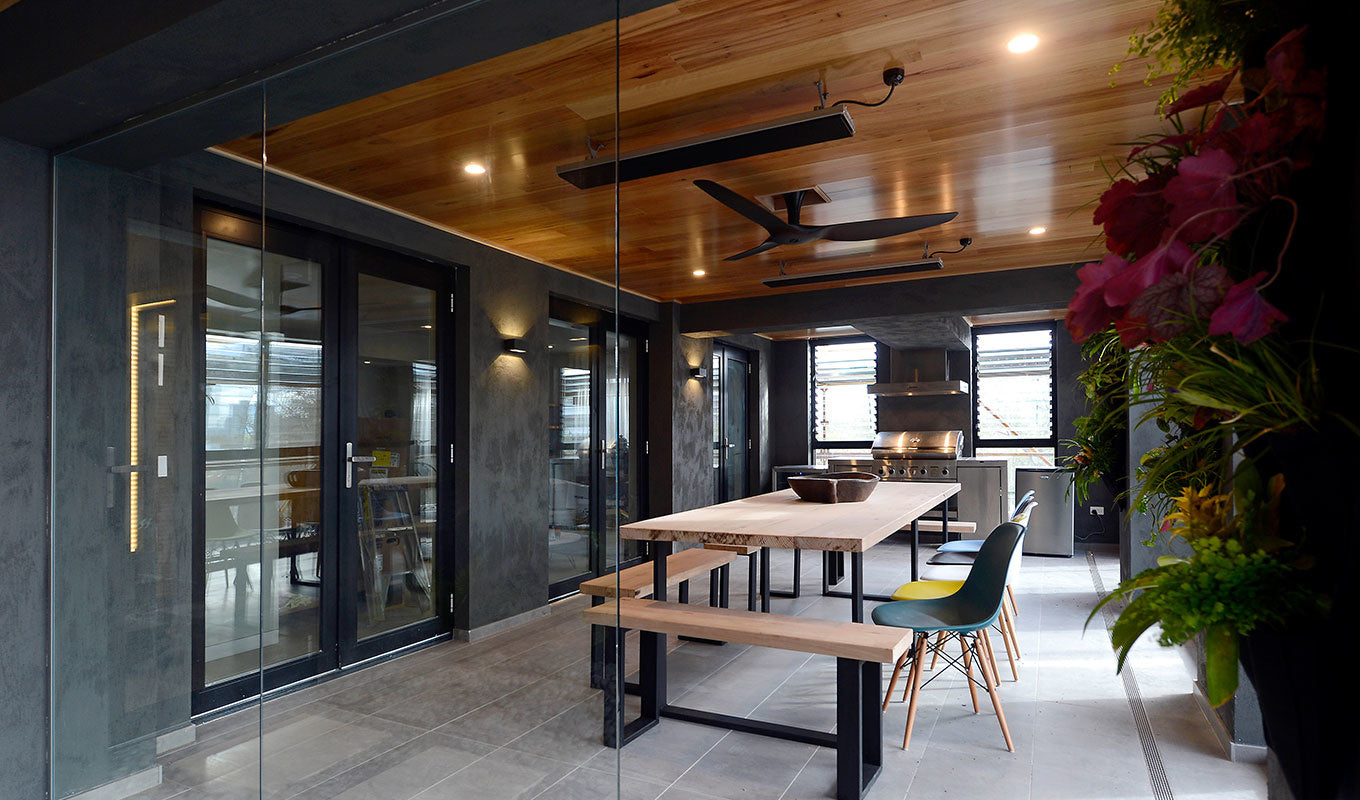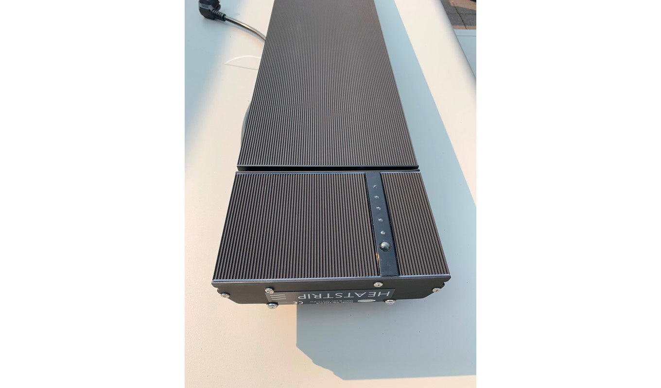De Heatstrip Design 2400 watt + Remote + App is een zeer hoogwaardige, volledig zwarte, straalverwarmer uit Australië, met zijn 2400 Watt is het een stijlvolle elektrische terrasverwarmer met een hoge stralingswarmte. Deze fraaie, geheel mat- zwarte Heatstrip heeft een veel hoger rendement dan bijvoorbeeld een terrasverwarmer op gas. Voor overdekte buitenruimtes is deze terrasverwarmer perfect. Denk bijvoorbeeld aan een veranda, patio en ander soort overkappingen, ook onder een zonnescherm werkt hij goed. En natuurlijk is hij ook geschikt voor een horecagelegenheid, zoals een sportvereniging, restaurant, bar enzovoort met een overkapping. Ook voor binnen gebruik zoals in een werkplaats, showrooms en magazijnen en hij is dan vooral geschikt om specifiek één plaats, bijvoorbeeld een inpakruimte, te verwarmen. Het unieke aan de Heatstrip Design is dat dit de eerste geheel zwarte terrasverwarmer is, waarbij er gebruik is gemaakt van de nieuwste coating die optimaal warmte afgeeft. Als extra heeft deze uitvoering ook een trafo die in 2 standen te schakelen is met een afstandsbediening die ook nog een timerfunctie heeft zodat hij automatisch na de ingestelde tijd uitgaat (1, 2 of 4 uur). Daarnaast kan je deze Heatstrip bedienen met een App op je telefoon, Google Hub & Alexa. Connect via Wifi of Bluetooth en schakel naar de stand die je prettig vind en zet hem aan en uit.
