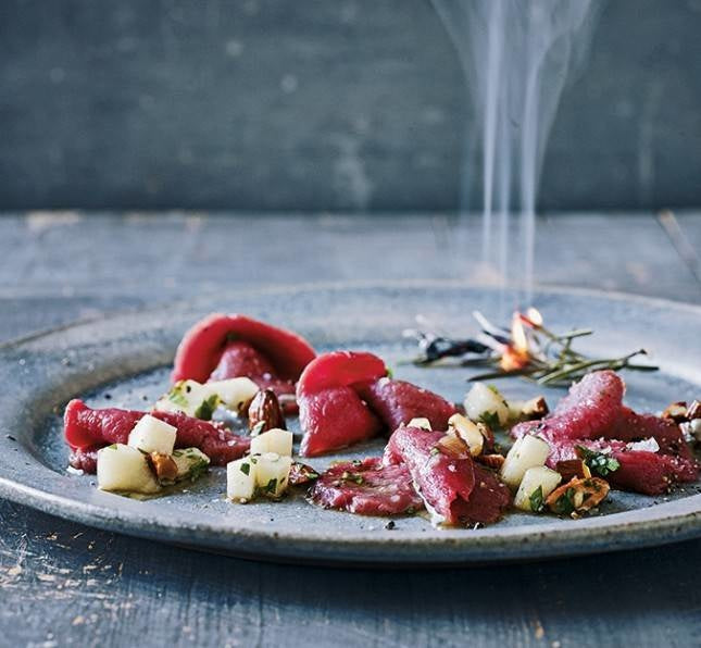 Carpaccio van hertenfilet, rucola en gebakken appel