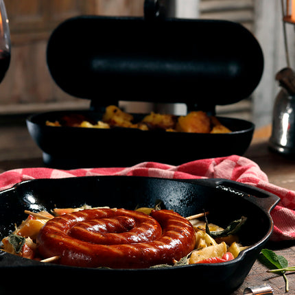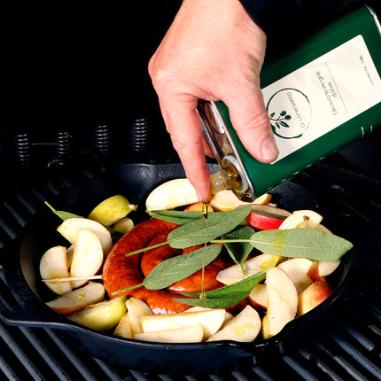 Dan vetten we hem even in met wat olijfolie en plaatsen de worst in de skillet.