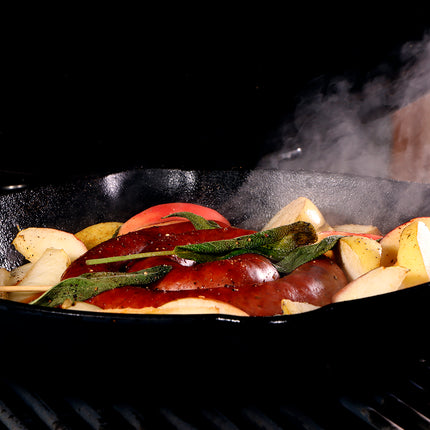 De Petromax skillet plaatsen we op het RVS rooster en laten we opwarmen.