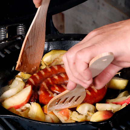 Halverwege draaien we de worst en appelpartjes even voorzichtig om.