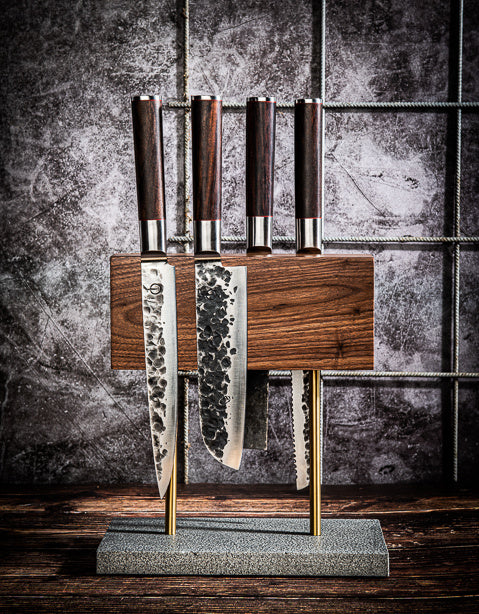Dit stijlvolle messenblok laat je messen prachtig uitkomen; onmisbaar voor messen met een fraai bewerkt lemmet. Het blok is aan beide zijden te gebruiken en is vervaardigd uit walnoothout. Het messenblok staat op een natuurstenen voet. Het messenblok heeft een lengte van 25 cm, een breedte van 12 cm en een hoogte van 27,5 cm.
