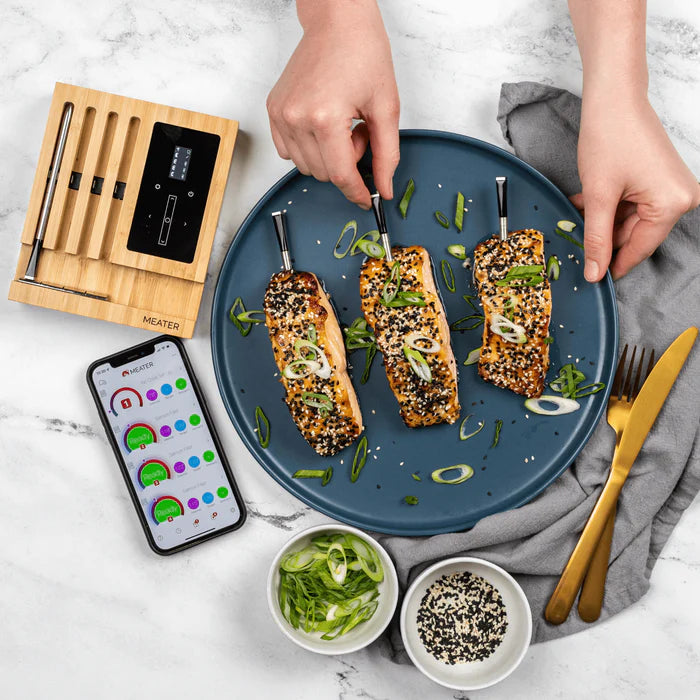 MEATER BLOCK® 4 meater probes in luxe houten oplader met wifipunt. Om zowel de kerntemperatuur als omgevingstemperatuur te kunnen volgen.... Lees meer