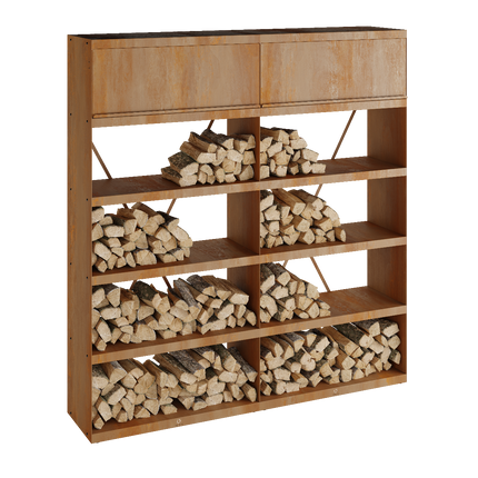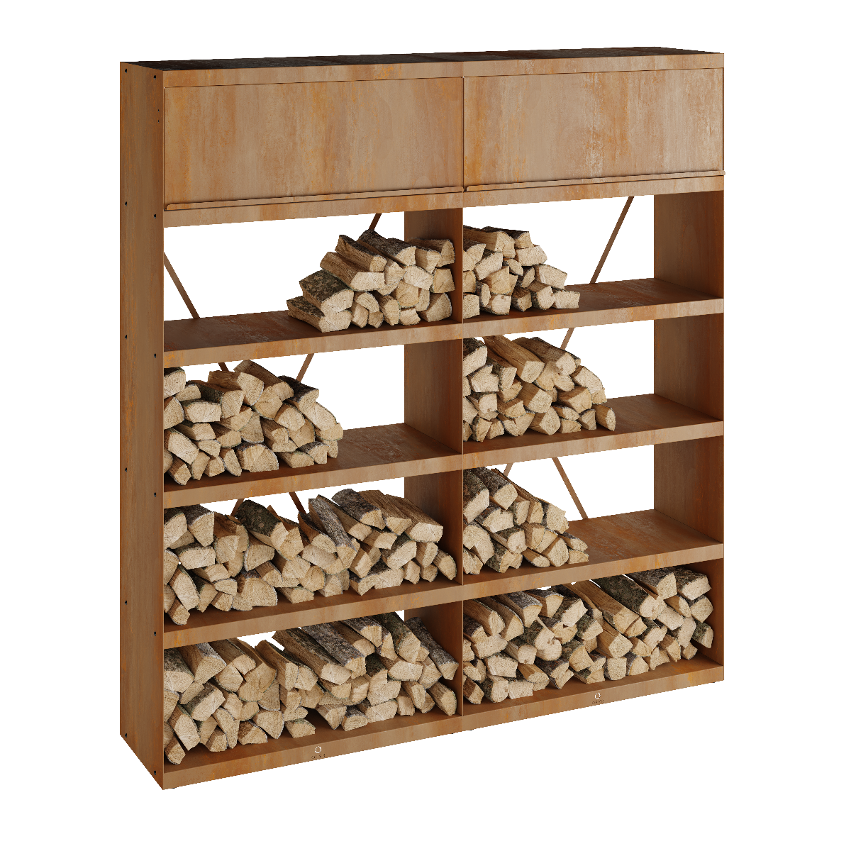 Deze stoere cortenstalen Wood storage 200  transformeert gestapeld hout in een decoratieve wand. Achter de klapdeurtjes op de bovenste plank bevindt zich een handige opslagruimte.