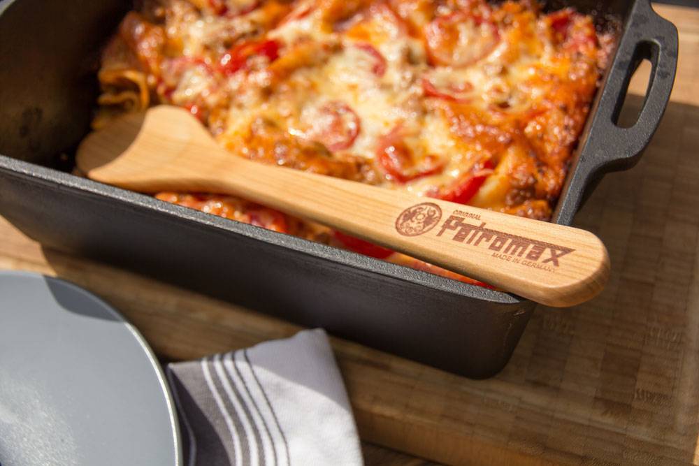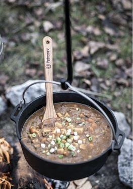 Dankzij de klassieke vorm met een ovale, ondiepe kom en een plat handvat ligt de lepel prettig in de hand en is hij geschikt voor uiteenlopende toepassingen: van het roeren van stoofpotten tot het serveren van gerechten. Het traditionele Petromax drakenlogo is in het hout gebrand en geeft de lepel die herkenbare, robuuste uitstraling.