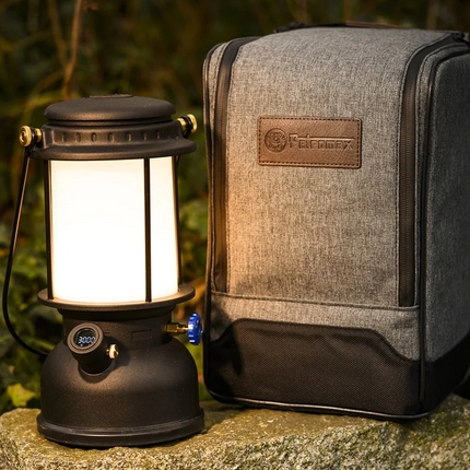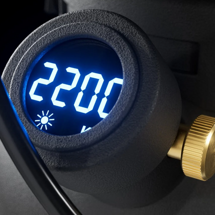 Een handig digitaal display toont het batterijniveau, de lichtkleur, de lichtintensiteit en de resterende brandduur in één oogopslag. De robuuste aluminium behuizing met messing details en het ontwerp dat is geïnspireerd op de klassieke Petromax HK500-lamp zorgen voor een authentieke uitstraling met betrouwbare prestaties – zelfs bij slecht weer.