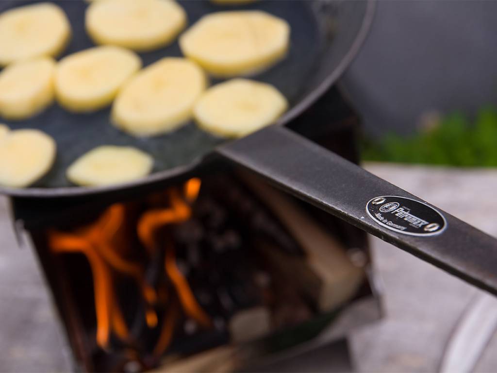 De pan wordt met de tijd donkerder en sterker, en wordt zo een onmisbare partner in de keuken én in de buitenlucht. Dankzij de stoere uitstraling is hij bovendien perfect om gerechten direct stijlvol in te serveren.