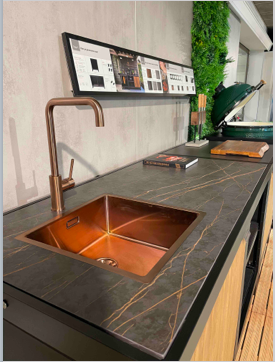 De spoelbak is vlak ingebouwd in een Dekton Blad, dit geeft het geheel een zeer strakke en luxe uitstraling.