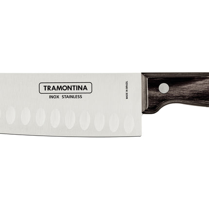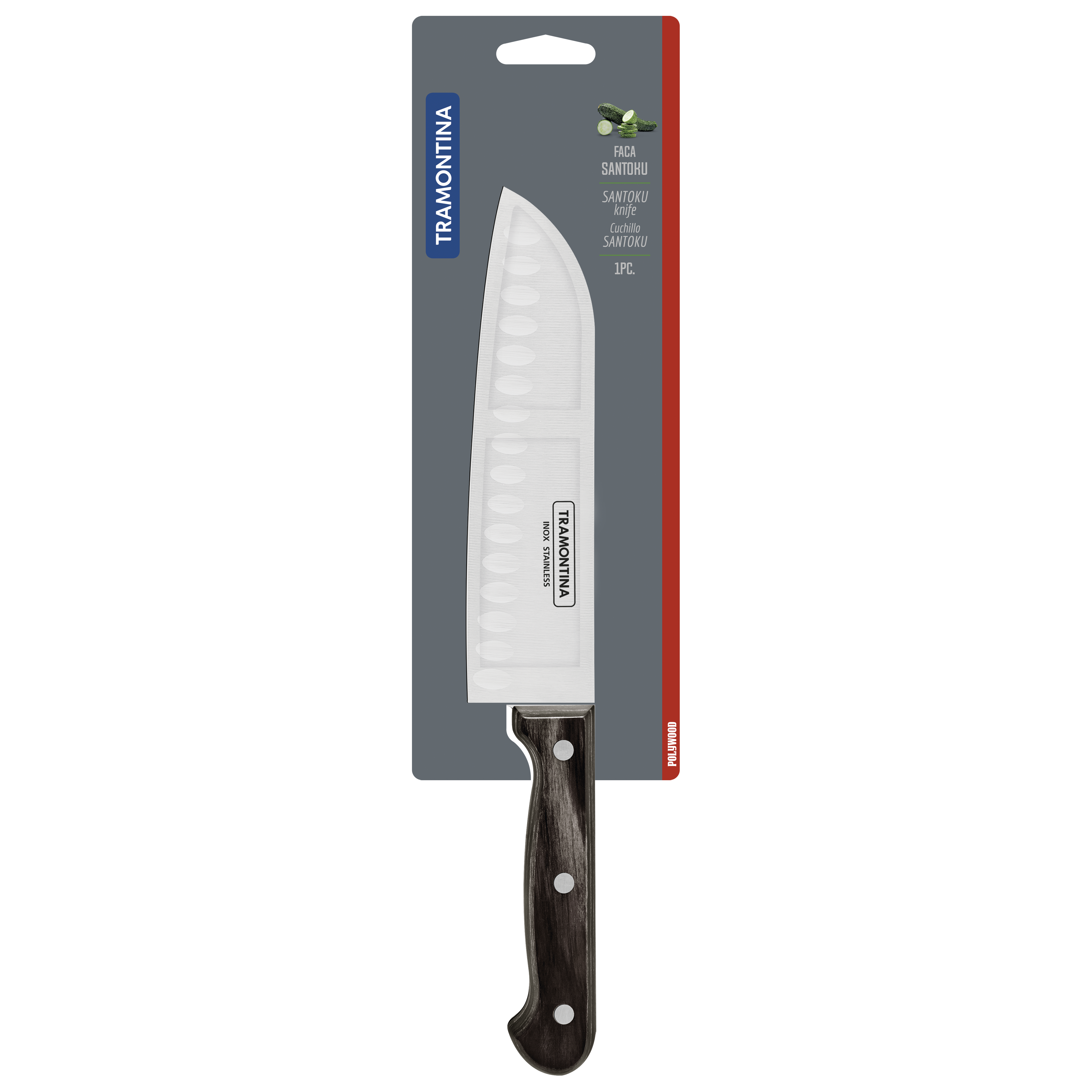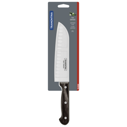 Het Tramontina Santoku Mes 17,6 cm is een veelzijdig en hoogwaardig mes, geïnspireerd door de Japanse keuken. Met een 17,6 cm roestvrijstalen lemmet, is dit mes perfect voor nauwkeurig snijden, hakken en fijnsnijden van groenten, vlees en vis. Dankzij de karakteristieke brede vorm van het lemmet is het ideaal voor snel en efficiënt werken, terwijl de uitsparingen in het lemmet ervoor zorgen dat voedsel minder snel blijft plakken.
