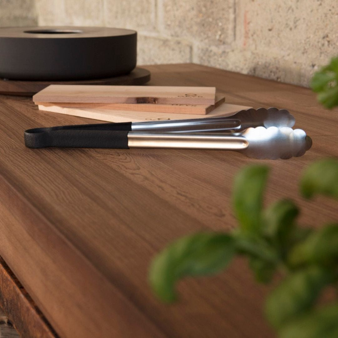 De tang is vervaardigd van roestvrij staal met een matzwarte afwerking en ligt prettig in de hand dankzij het ergonomische ontwerp. U kunt de tang op een werkoppervlak neerleggen of ophangen aan het ronde gedeelte als u hem niet gebruikt.