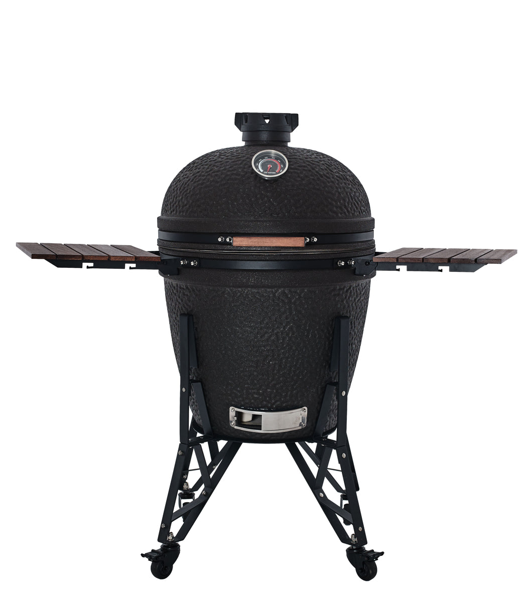 The Bastard Urban Large Complete is dé kamado voor wie serieus wil barbecueën met stijl. Deze matzwarte krachtpatser heeft een grilloppervlak van Ø 49 cm en is geschikt voor 6 tot 8 personen – perfect voor grote etentjes, tuinfeesten of lange zomeravonden met familie en vrienden. Met zijn robuuste onderstel en houten zijtafels is hij niet alleen praktisch, maar ook een echte eyecatcher in elke buitenkeuken of op je dakterras.