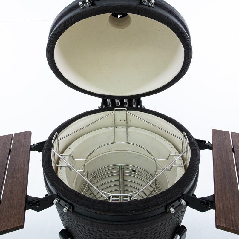 • Inclusief: 2 halve RVS grillroosters, Multi level rek met halve convector stenen, robuust onderstel en houten zijtafels