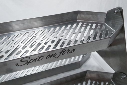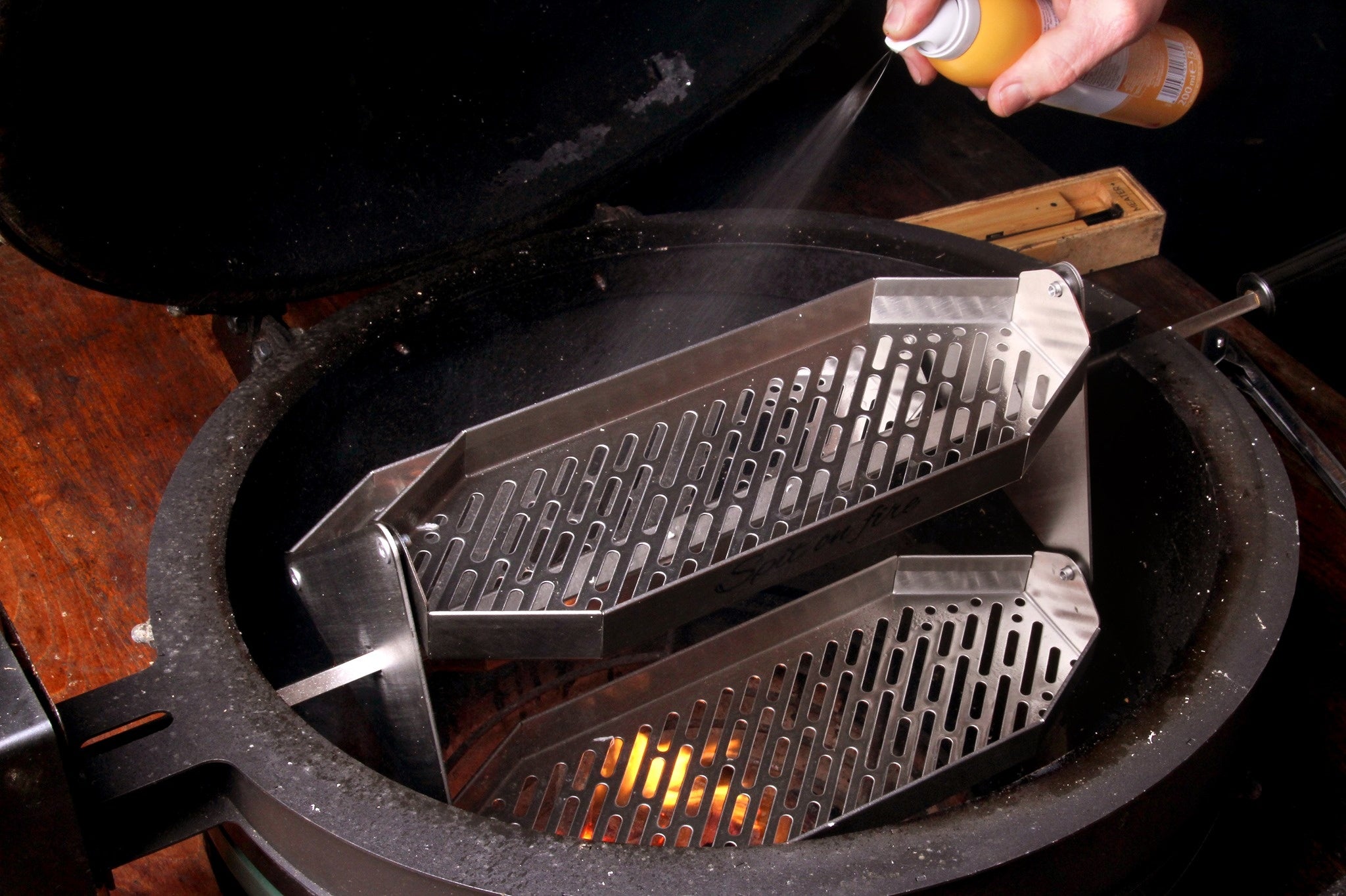 hij ook zeker op te monteren. (Let op bij gebruik kan het noodzakelijk zijn om de vuurring uit de kamado te halen) Want je schuift hem zo over je spit heen. En met 2 schroeven te borgen op de spies.