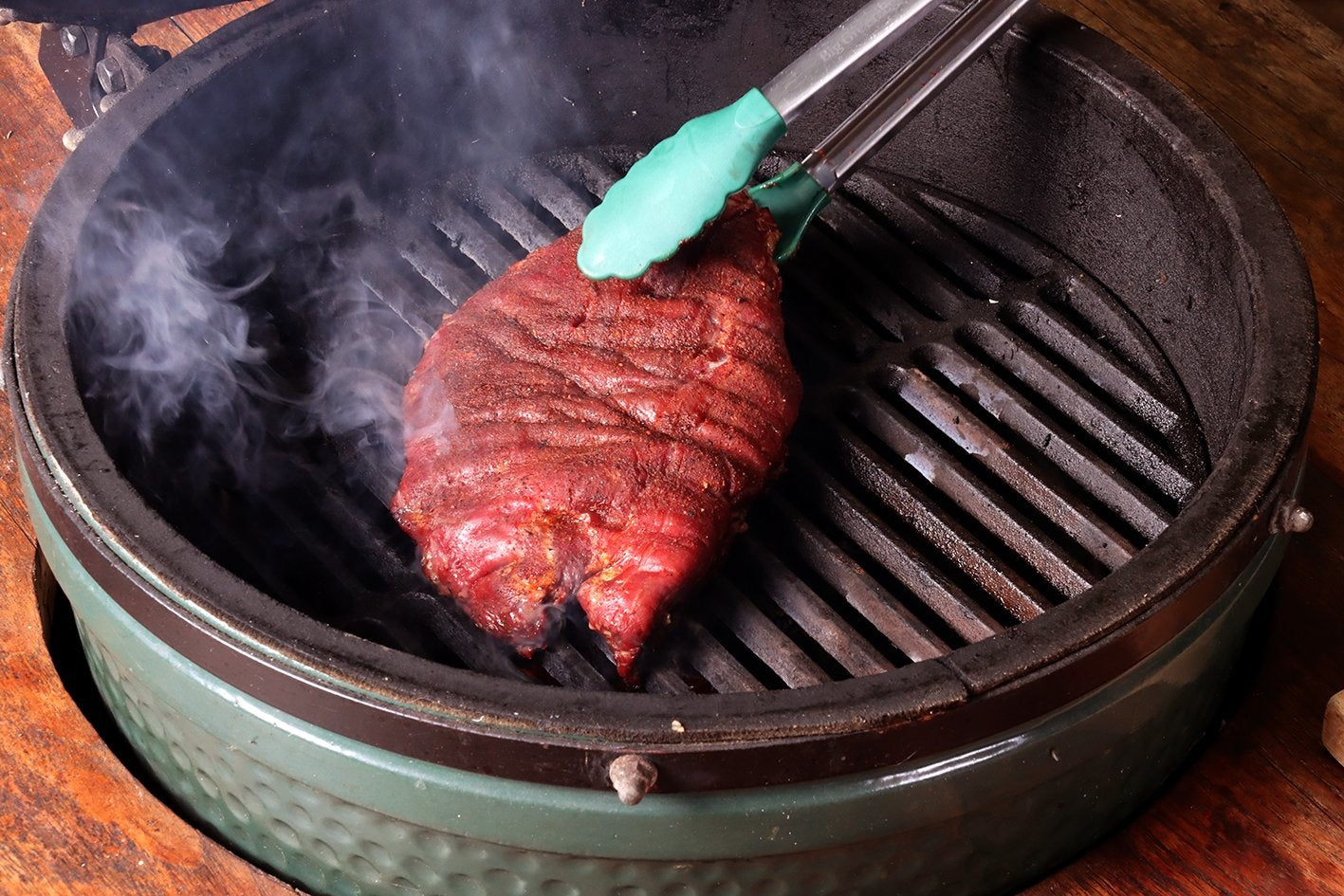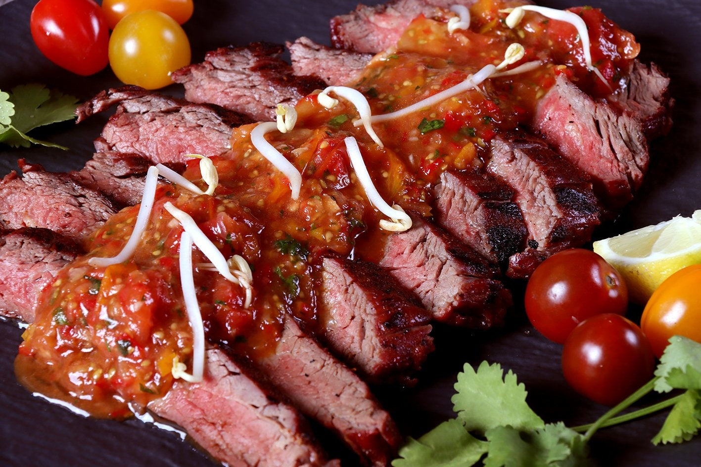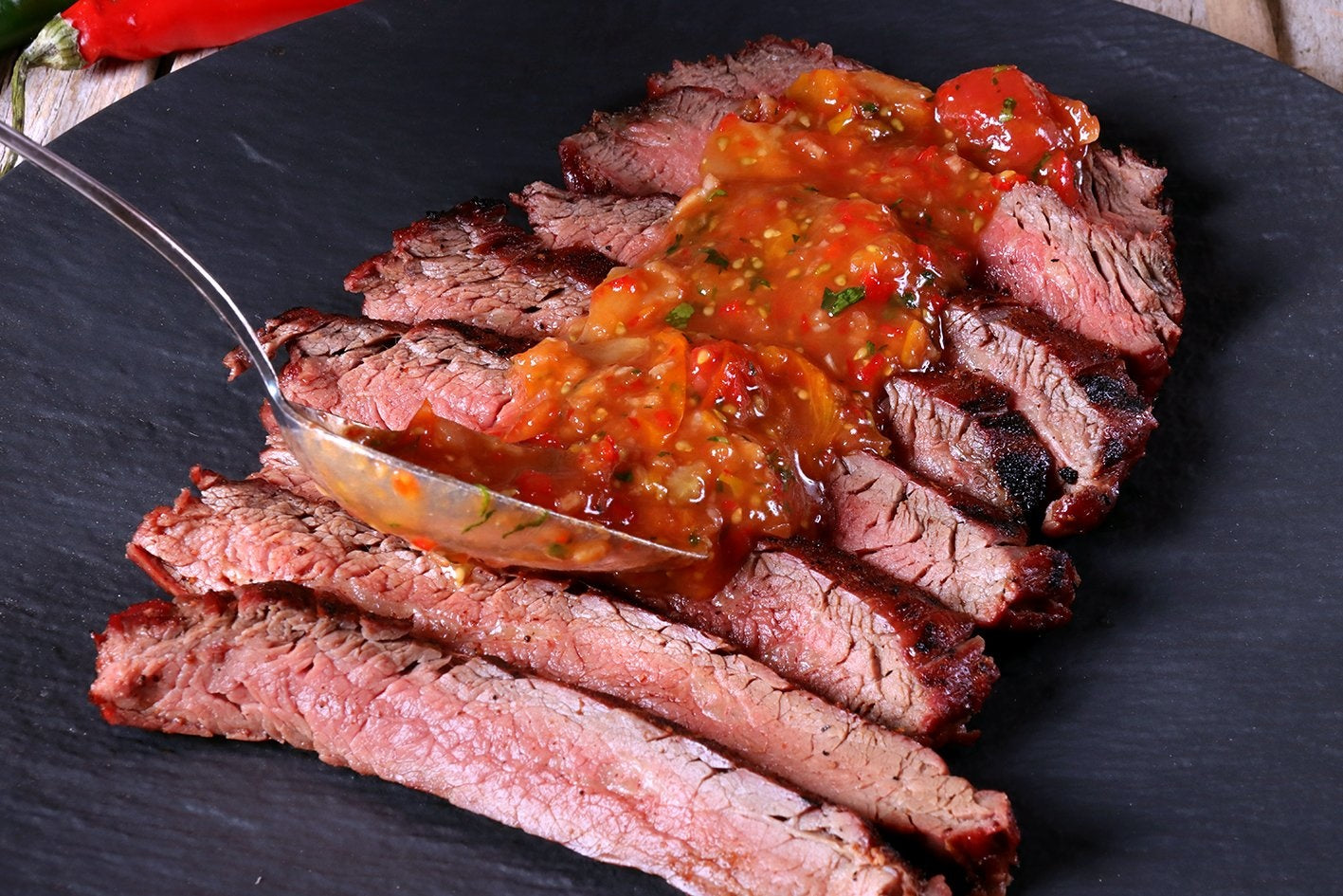 De flank steak – gesneden uit de buikspier van het rund – staat bekend om zijn grove vezelstructuur en uitgesproken karakter. Dankzij de graanvoeding is het vlees voorzien van een subtiele marmering, die bij hoge temperaturen prachtig smelt voor extra sappigheid.