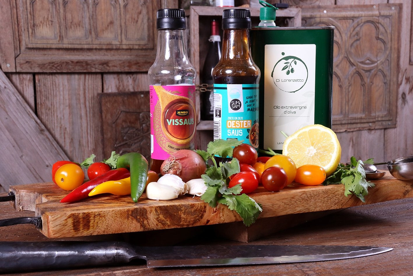 Laat de flank steak op kamertemperatuur komen en marineer licht met olijfolie, knoflook en verse kruiden. Grill op hoge temperatuur (250°C+) voor een stevige korst. Houd 4–5 minuten per kant aan voor medium-rare (kerntemperatuur 54°C). Laat daarna minstens 5 minuten rusten en snijd dwars op de draad in dunne plakjes, schuin onder een hoek van 45 graden. Zo behoud je de malsheid én krijg je een fraaie presentatie.