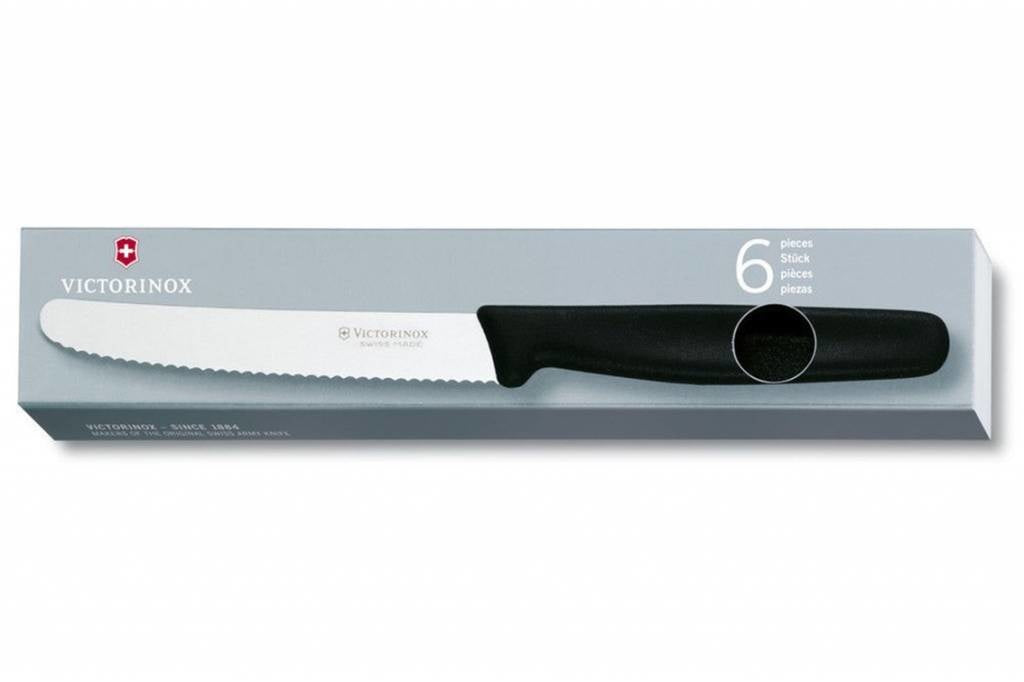 Met het zeer bekende tafelbestek van Victorinox haalt u echte Zwitserse kwaliteit in huis! Deze tafelmessen bevatten een vlijmscherpe gekartelde snede die perfect is voor vrijwel elk voedsel. De messen zijn gemaakt van roestvrij staal met een handvat van zwart kunststof. Hierdoor zijn deze messen vaatwasserbestendig.