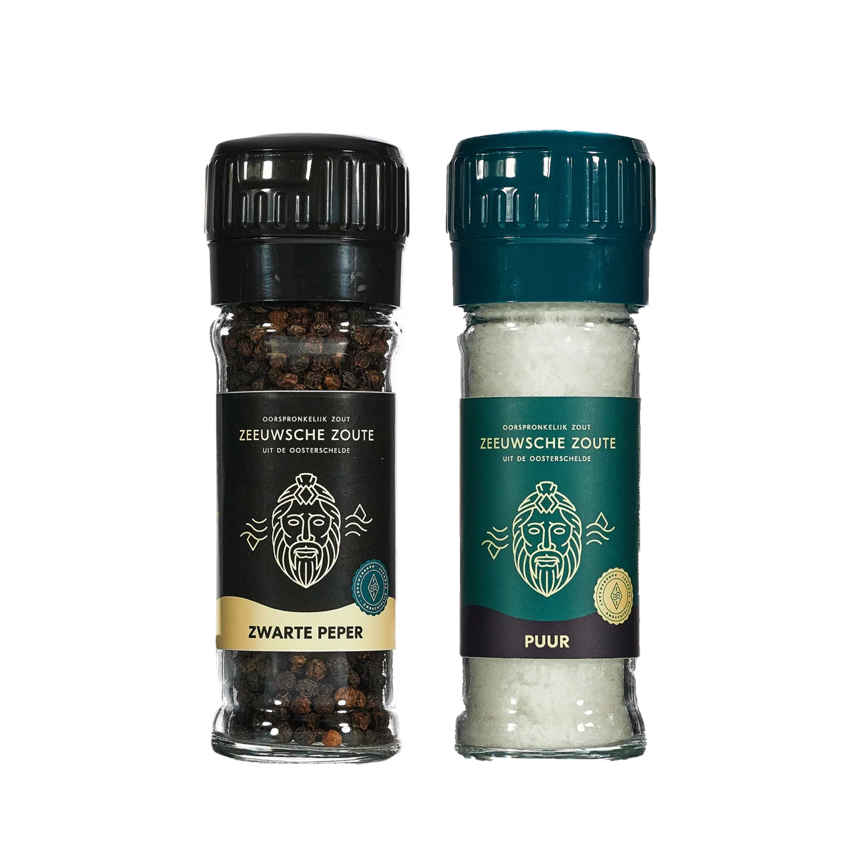 Zeeuwsche Zoute om cadeau te doen! Geef met deze mooie cadeauverpakking een zoutmolen met Zeeuwsche Zoute Puur en Zeeuwsche Zoute Zwarte Peper aan jouw favoriete keukenprins(ess)en.  Peper en zout zijn de basis van elk gerecht. Of je het nu in een lekkere pastasaus verwerkt, op een biefstuk strooit of in olijfolie strooit als dip voor brood, het is een heerlijke combinatie. Daarom is een passend peper- en zoutstel het ideale cadeau! Goed om te weten, onze Zwarte Peper is biologisch!